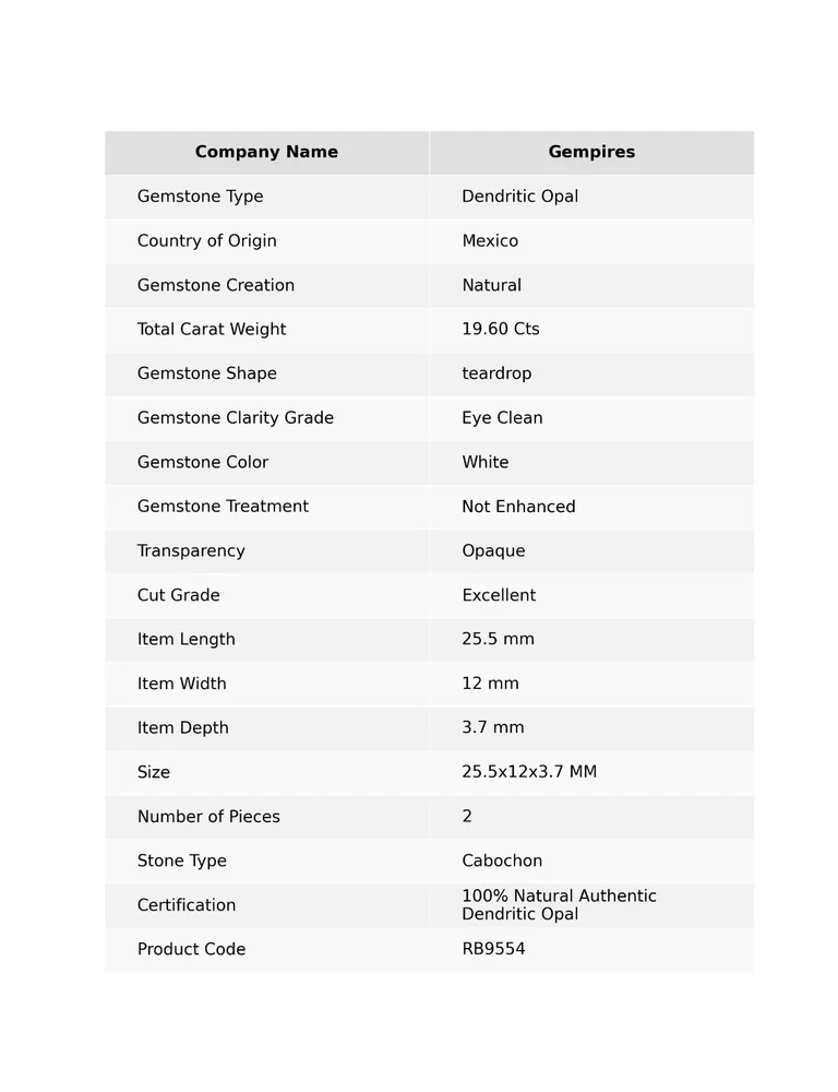 Welcome To Gempires The product is a set of two teardrop-shaped Dendritic Opal gemstones, each measuring 25.5mm in length and 12mm in width, with a depth of 3.7mm. The gemstones are white in color and have an excellent cut grade, showcasing a polished finish. They are 100% natural and authentic Dendritic Opals from Mexico, with eye-clean clarity and no enhancements. The gemstones are opaque and are sold wholesale, making them ideal for jewelry making or collection. 19.60 Cts Natural Dendritic Opal teardrop Cabochon 2 Pcs Supply 25.5x12x3.7 MM Check My Other Dendritic Opal Listings : Click Here Note: For Custom / Bulk Order, Please contact on Ebay Message Service. QUALITY ASSURANCE:- The photo may not give you the actual size, please refer to the item description for size details. Our product Images are original. We dont use Photoshop for any editing. We always do our best to display an actual image of the gemstone which is to be delivered to our customers. We check all our items and ensure the best quality standards. The item weight may vary 5% (+/-) at maximum and size may vary .10 cents (+/-) as per the gemstone standard. Return Policy:- Any reason, if you are not satisfied with our product, you may return item within 14 days from the date of product delivered. The Item must be returned in its original condition. Return shipping will be paid by buyer. Shipping Policy: At Gempires, we offer two shipping options for our customers: Standard Shipping: 13-15 Days Express Shipping: 5-7 Days Standard Shipping: Our standard shipping option takes approximately 13-15 days for delivery. Please note that this is an estimated time frame and may vary depending on your location and any unforeseen circumstances. We strive to ensure that your order is processed and shipped as quickly as possible. Express Shipping: If you need your order delivered quickly, we offer an express shipping option that takes approximately 5-7 days for delivery. This option is available at an additional cost, which will be displayed during the checkout process. Please note that this time frame is an estimated delivery time and may vary depending on your location and any unforeseen circumstances. Handling Time All orders are processed and shipped within 1-2 business days after payment has been received. Once your order has been shipped, you will receive a tracking number via Ebay notifications, which you can use to track your package. Custom Duty Note Please note that we are not responsible for any customs or import duties that may be charged once the package reaches your country. These charges are the responsibility of the buyer and are not included in our shipping fees. We take great care in packaging our products to ensure that they arrive at your doorstep in pristine condition. However, if your package arrives damaged or you have any other concerns about your order, please don't hesitate to contact us. We will do our best to resolve any issues and ensure that you are satisfied with your purchase. Feedback Policy:- At Gempires, we value your feedback and strive to provide the best customer experience possible. We welcome your reviews and appreciate your time in sharing your thoughts about your purchase with us. If you are satisfied with your purchase and our service, we would love to hear about it. Your positive feedback can help other buyers make an informed decision about our products and services. If for any reason you are not completely satisfied with your purchase or our service, please reach out to us before leaving a negative review. We are committed to resolving any issues that may arise and ensuring your satisfaction. Thank you for choosing Gempires for your natural gemstone needs. Your feedback is valuable to us, and we look forward to providing you with exceptional service in the future. Best Regards Gempires