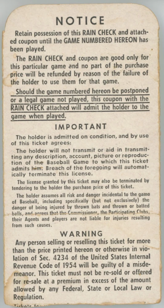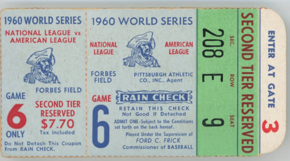 1960 Ticket World Series Game 6 Ex+ Elusive ticket, this is in terrific condition. A full stub with bright color and no condition issues, this is a real keeper! Clean Sweep Auctions has been buying, selling and auctioning off quality cards and memorabilia since 1995. We are always looking for collections and better material. Please note if the picture does not match the listing, go by the title and not the picture. We accept returns on all items, framed items will be removed from the frame if larger than 11x14 as we offer free shipping. We grade autographed items on a scale of 1/10, this is our opinion of the signature, not a third party grade. The grade only refers to the autograph itself, not what it is signed on. All cards and autographs we sell are guaranteed to pass JSA or PSA for nine months from date of purchase unless we note them as being trimmed or altered. We only refund the direct purchase price, not authentication fees or related shipping fees, etc. We do require proof of rejection after the normal ebay return period.