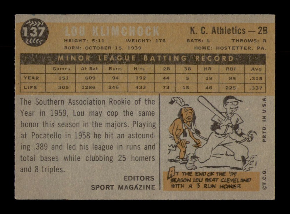 Sport: Baseball Year: 1960 Graded: No Card Manufacturer: Topps Season: 1960 Original/Reprint: Original Player: Lou Klimchock Series: Varies
