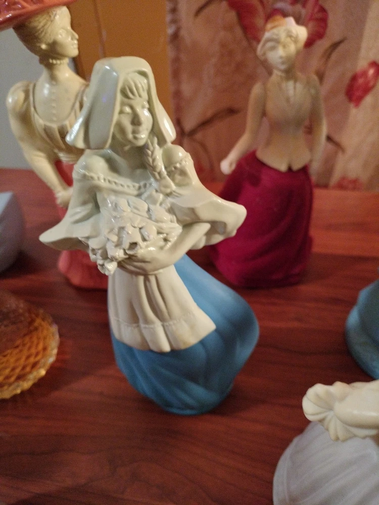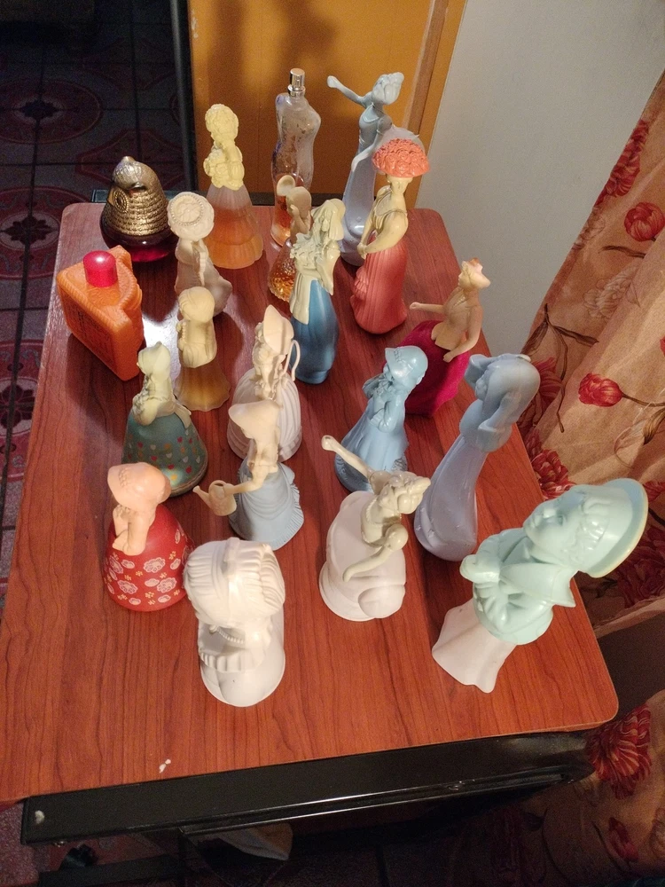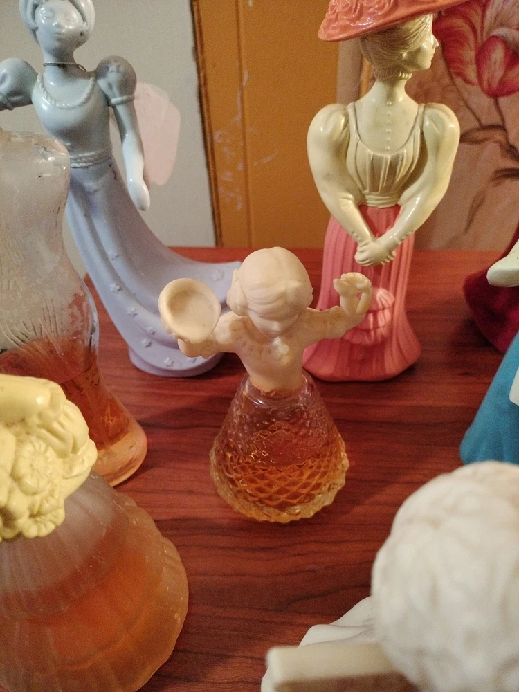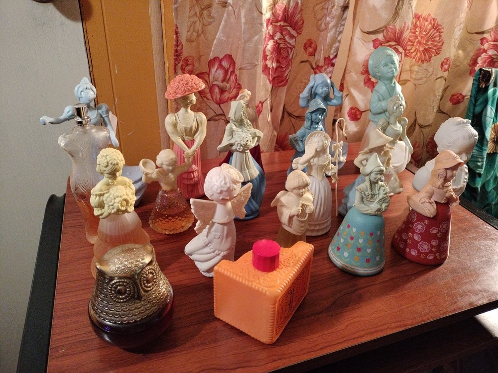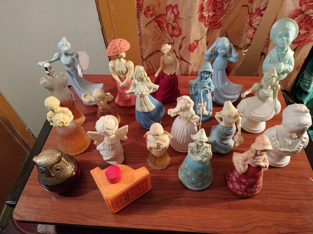 Belles of the worlds, 18th century classic figurines young girl (belles of the world), Dutch Maid(moonwind), Angel songs w/ llyre, Mary Mary (topaz), little girl blue(topaz), Garden girl (sweet honesty), Heavenly Angel (sweet honesty), Gay Nineties Fashion figurines (somewhere), Victorian Lady (sweet honesty), Owl Fancy gelee decanter(raining Violet, roses, roses, Fly- A - Balloon(birds of paradise) .This is a whole sales deal not by pieces.. buy all collectibles vintages 1960's to 1980's Avon filled and Empty bottle scent mostly bottle are filled with their original scent, some are full , half, for $250 twenty one (21) bottles...