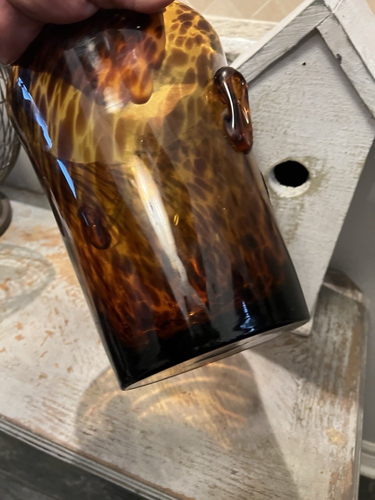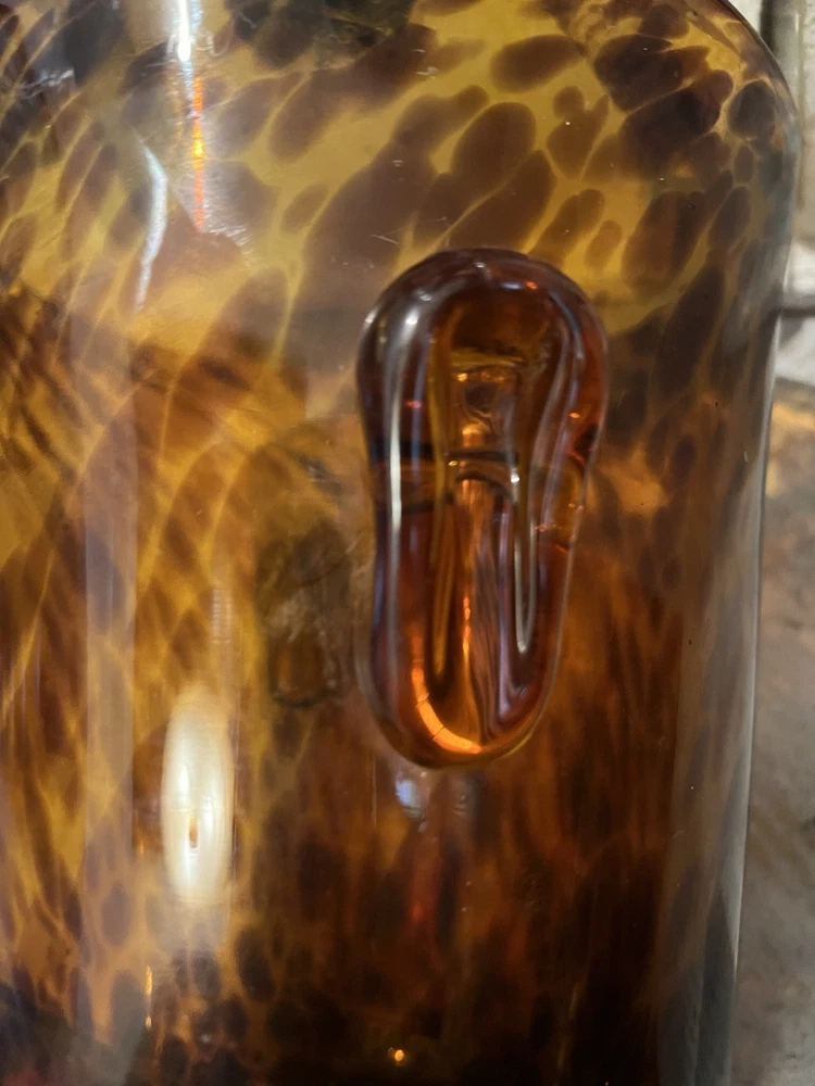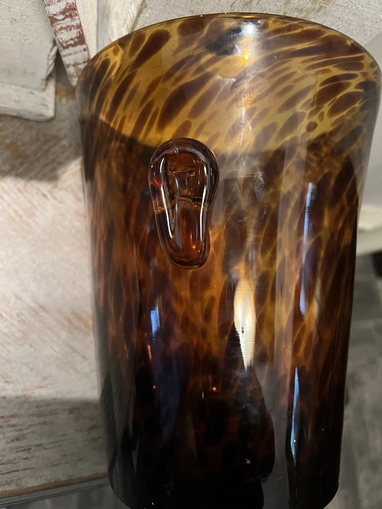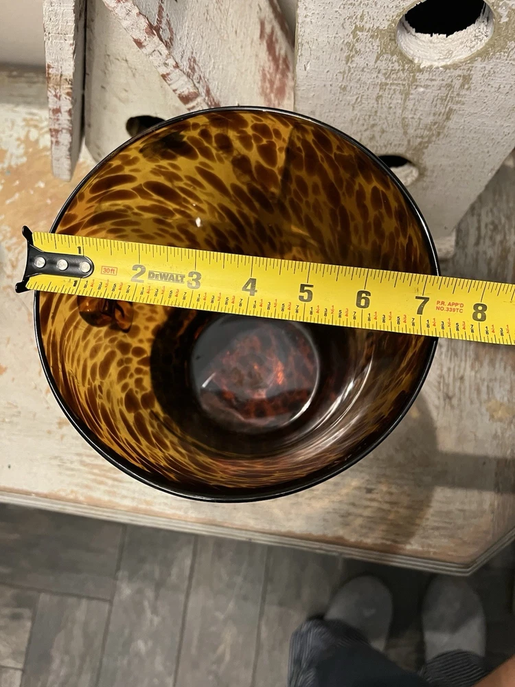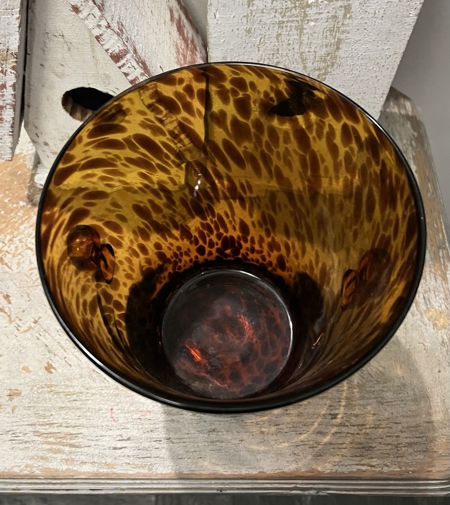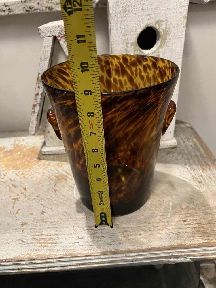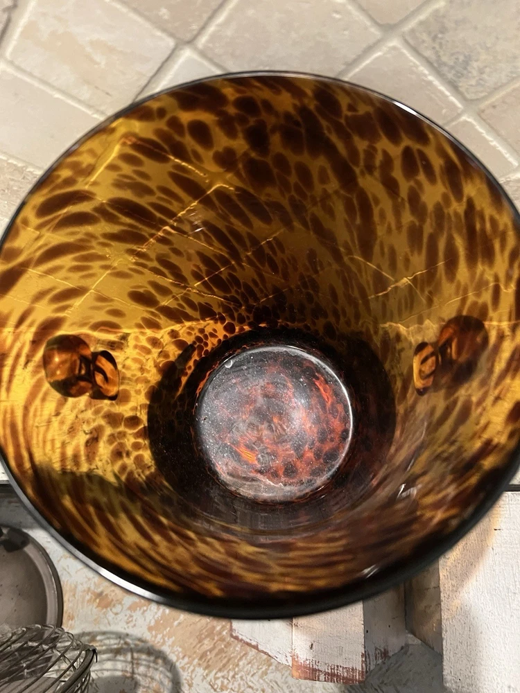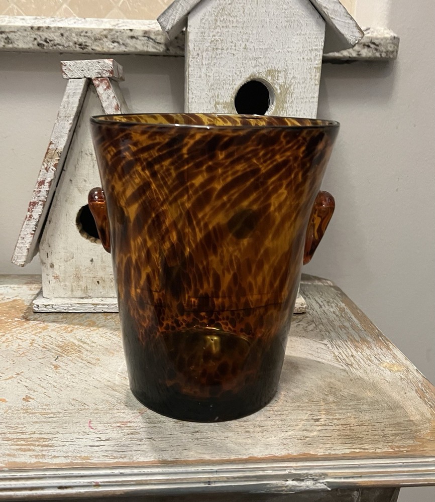 This vintage 1960s Italian tortoiseshell handblown glass champagne/wine cooler bucket is a stylish and unique ice bucket perfect for chilling and serving beverages. The tortoiseshell color and 1960s style add a touch of retro elegance to any table setting. Made of glass and featuring a convenient handle, this ice bucket is not only functional but also a charming decorative piece for any home bar or entertaining spaces. See pictures for measurements. Rare piece.
