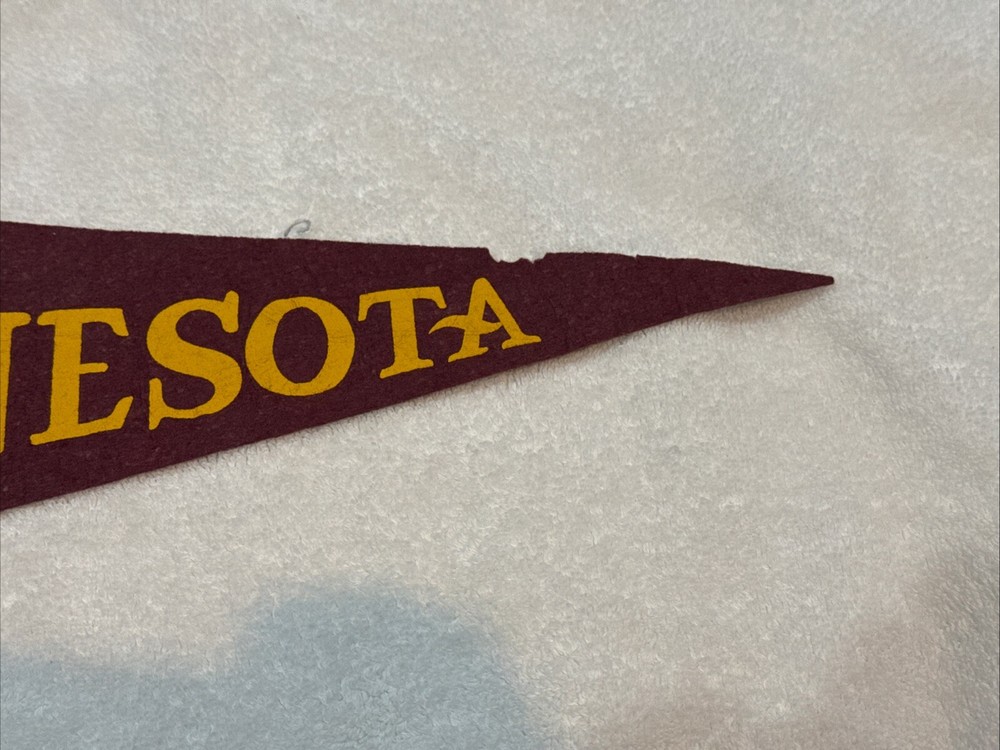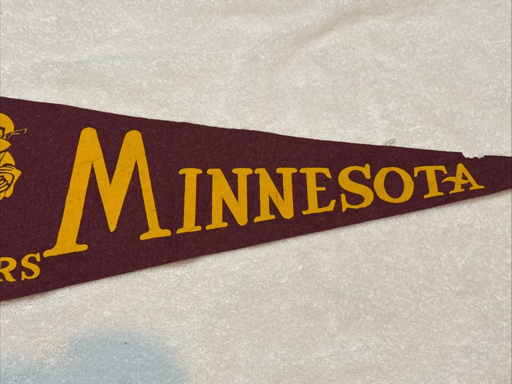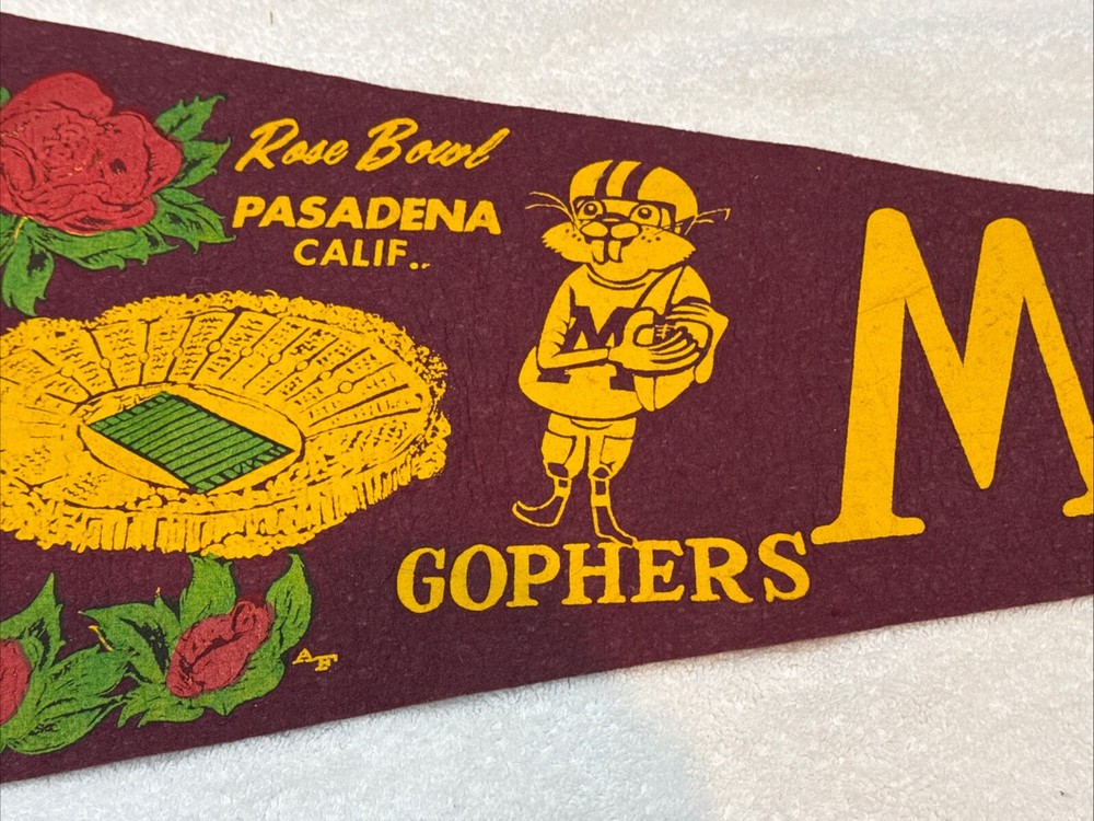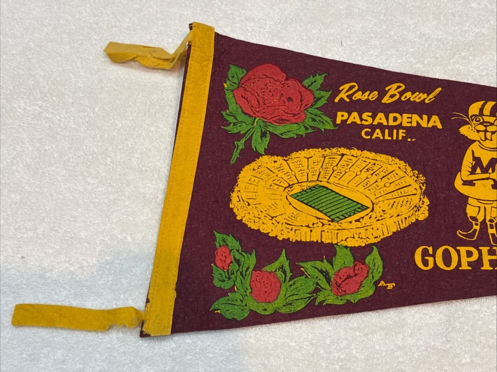 You are purchasing a VERY NICE circa 1960-61 Minnesota Gophers Rose Bowl pennant. This is a full size pennant. Measures about 29 inches long plus the tassles. Soft felt material. Gold and maroon colors are vivid. Lettering shows the slightest bit of wear. Minimal tip wear. Has no pinholes in corners. Small moth holes at top edge of pennant near tip as shown. Missing one of the bottom tassles. Pennant displays beautifully. I would grade it EX. NICE vintage Gophers item! Buyer pays $10.00 shipping. Shipping combined on multiple lots whenever possible. MN residents add 6.875% sales tax. Thanks for your purchases! Please check out my Ebay store for more great items!