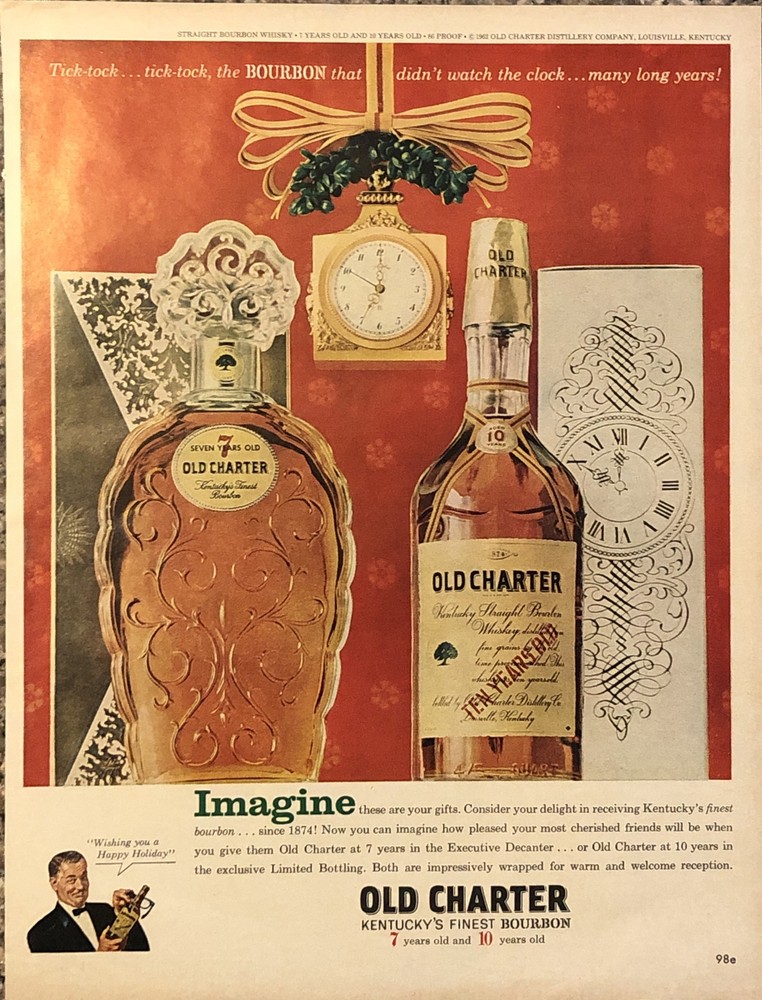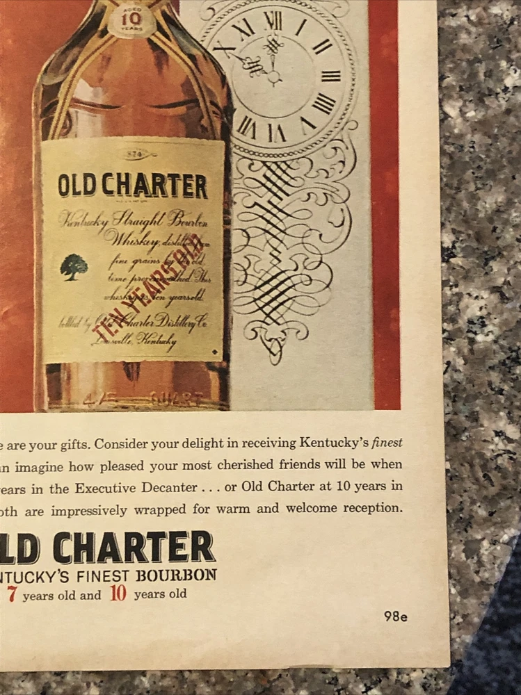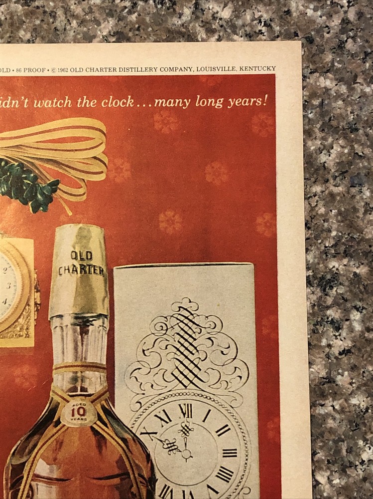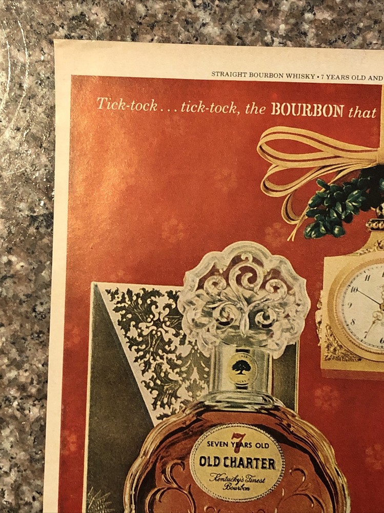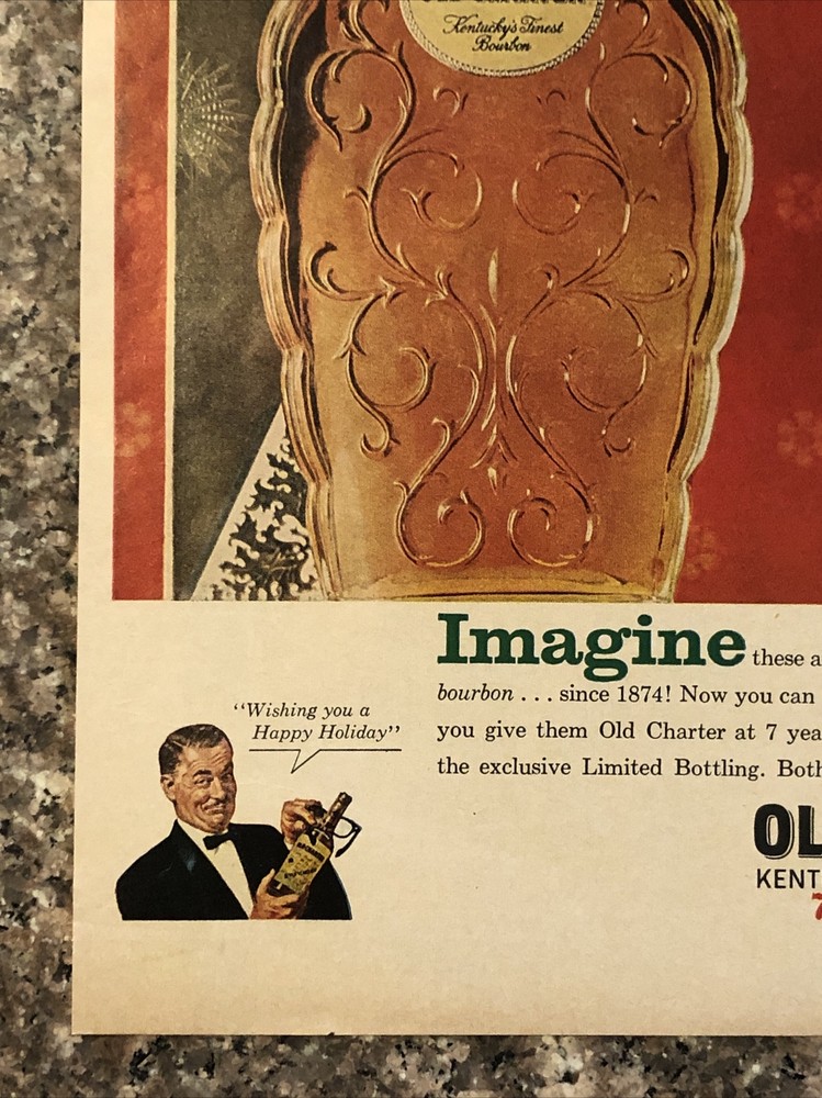 This vintage 1962 Old Charter Bourbon Christmas advertisement is a true gem for collectors of advertising memorabilia. The multi-color magazine print ad features an executive decanter and highlights the theme of distillery. The ad is an original from the United States and dates back to the 1960s. It is a great addition to any collection of food and beverage related items, particularly for those with an interest in distillery advertising. Buy now to add this rare find to your collection! Original approximate 10”x14” vintage magazine print ad.