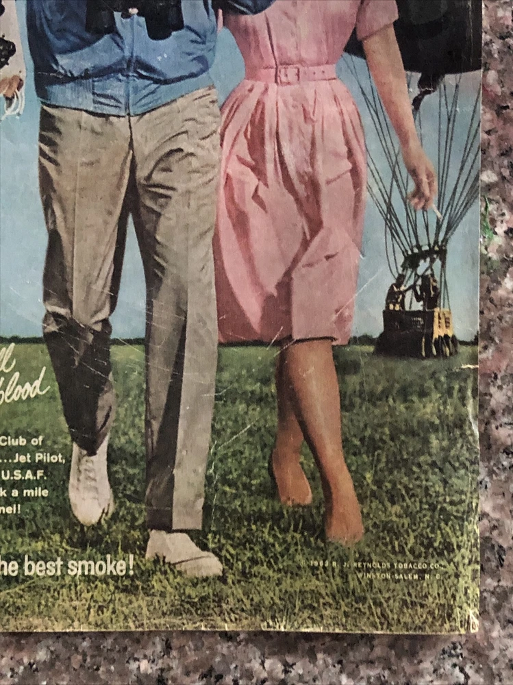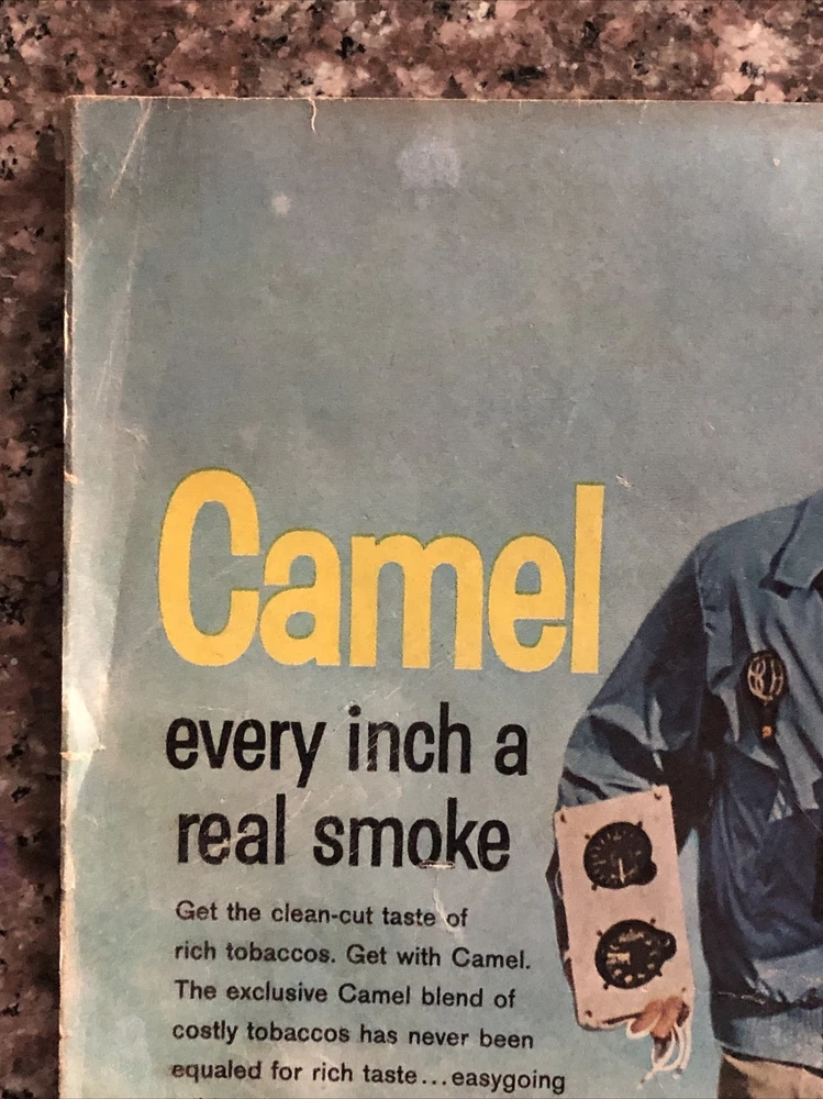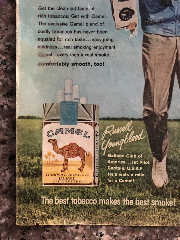 This vintage print ad from 1963 features a colorful illustration promoting Camel cigarettes. The ad features Russell Youngblood, member of the Balloon Club of America and jet pilot captain in the US Air Force. The ad is a great addition to any collection of vintage advertising from the 1960s. Overall, this vintage print ad is a unique piece of history and would make a great addition to any collection. Original approximate 8”x11” vintage magazine print ad.
