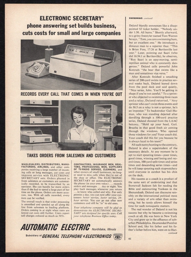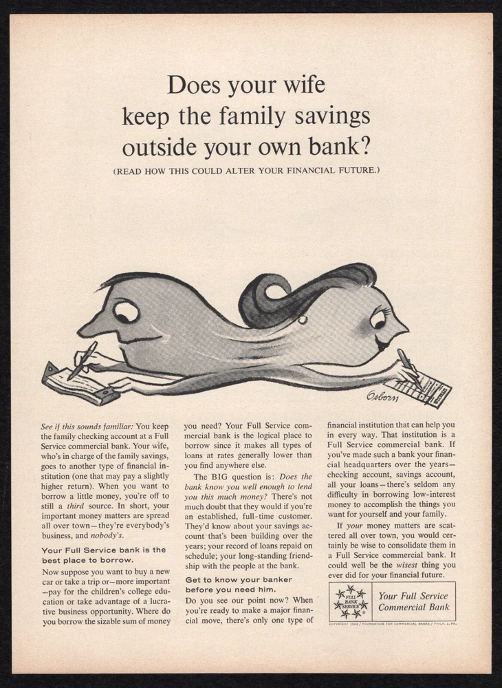 1963 Full Service Commercial Bank Wife Keep Family Savings Outside Print Ad Vtg Original Advertisement Page Placement: Interior A single page, with both sides scanned and described. Suitable for Framing M any older magazine text/images were printed mis align ed with the edges. Even within the page, text and images can be misaligned with each other. Trimming all four edges doesn’t always fix the issue, and leaves less room to mat. As of 3/20/2024 I trim only the single edge that was attached to the spine, at 90 º to the top edge , and will leave the other edges untouched. Except for the single trimmed edge, you’re seeing the full page exactly as it was created . As a result, sometimes the text and in-page images may look tilted; this leaves more space for matting later. You can see the entire page, edges and all, resting on a black border to help you judge overall condition. No virtual cropping to make it look perfect, no hidden surprises when it arrives. Ad Description/Company Name : Side 1 : Full Service Commercial Bank Does Your Wife Keep The Family Savings Outside Your Own Bank? (art by Osborne) Side 2 : Automatic Electric subsidiary of General Telephone & Electronics Electronic Secretary phone answering set builds business, cuts costs for small and large companies. Publication Date: 19 6 3 March 25 Publication Name: Sports Illustrated Magazine Size: Approx 1 1 ¼” x 8 ¼” Condition : Used. These are original pages from original magazines. They are very old, and usually stored in less-than-perfect environments. F oxing, fading, discoloration are common and present to some degree . Also corner folds, edge damage, creases, ripples, scuffs , smudges and other imperfections are normal . Pages may show pressure marks from production or years of storage . Images are scanned on black background, NOT matted or framed. Many older mag azines print ed misaligned with the ir edges . I only trim the spine edge , leaving the other three sides untouched. When you mat the page, you can align as desired. The images are the EXACT SAME PAGE BEING SOLD AS IS . PLEASE EXAMINE CLOSELY AND MAKE YOUR OWN JUDGMENT. NOTES : If there’s anything NOT Included in the typical conditions listed above, and that cannot be seen in the images, I’ll add it here . Your satisfaction guaranteed. If you have any questions or qualms, feel free to ask! Ideal for: Collectors Historians Gifts Themed decoration for home or business Museums Magazine ads are shipped in: 2-mil Clear Polypropylene Magazine Bags with a white backer board, in a Rigid Mailer, in a sealed Poly Mailer, marked "Handle With Care, Do not Bend" and shipped USPS. We DO combine shipping for multiple purchases!
