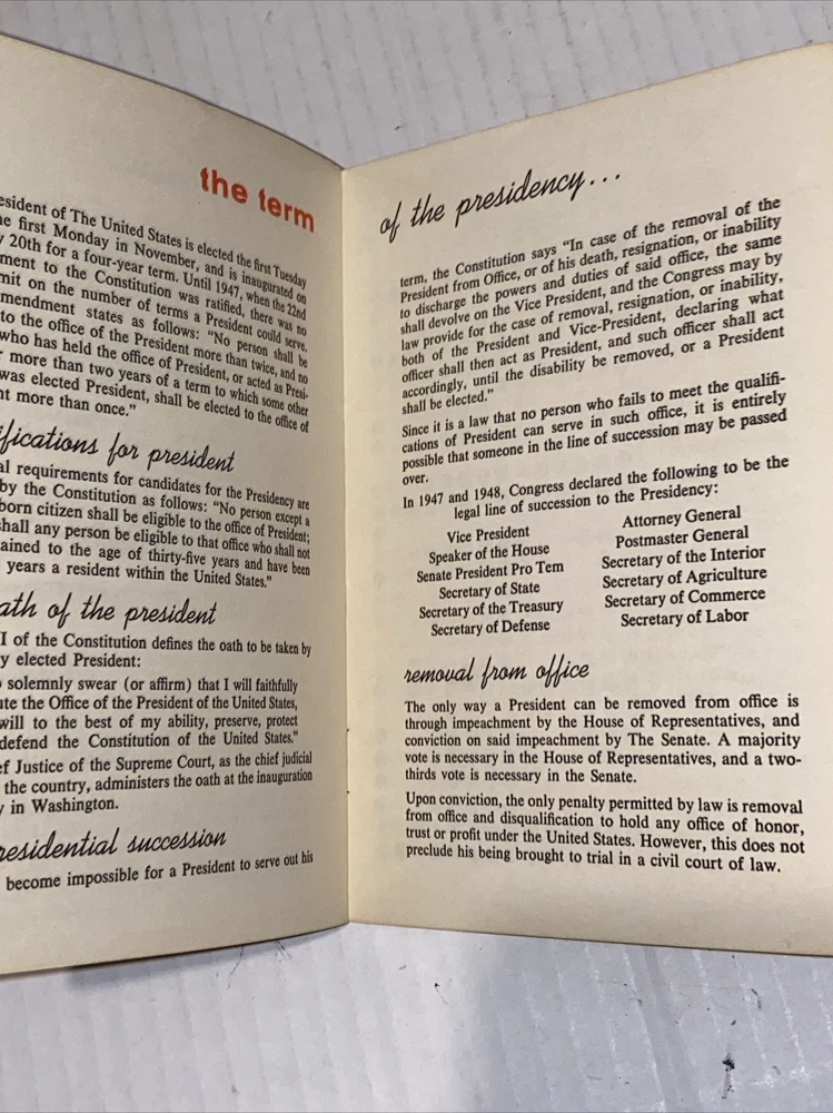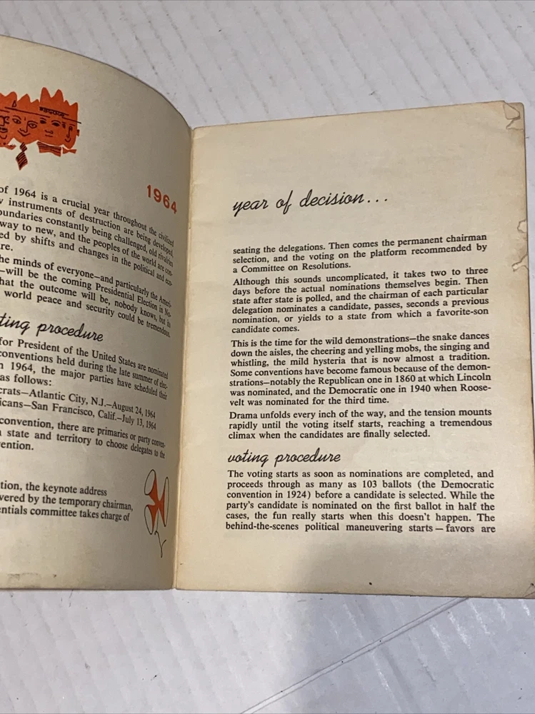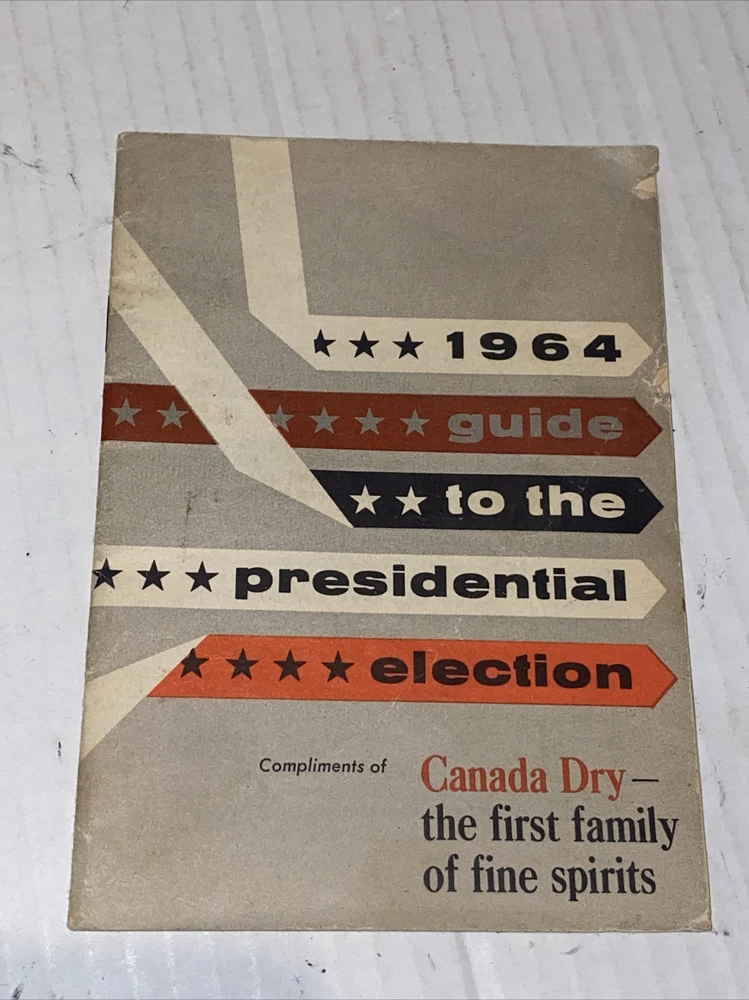 Very cool piece of advertising history along with presidential history as shown it is 23 pages long made in 1964 and there is somewhere including some creasing and small nicks to pages. I have searched every place on the Internet and I cannot find another one of these so I am kind of starting the price off high, but I am willing to accept offers. This is a rare and original 1964 guide to the presidential election, compliments of Canada Dry Soda Advertising. It features a vibrant multi-color design with valuable information about the election and candidates. The guide is a unique collectible item that would make a great addition to any advertising or soda collection. The country of manufacture is the United States and the guide is in excellent condition. It is a must-have for any serious collector.