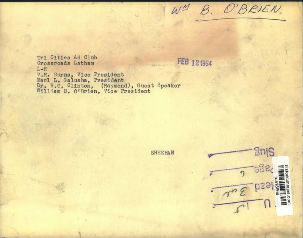 ebay template Note: Please study the images carefully to determine the condition of this vintage photograph, as it may not be in perfect condition. It may contain wrinkles, cracks, and possibly even tears due to its age and how it was handled before it got to us. A scanner may interpret colors and contrast differently than human eyes will, so it is possible that the actual photograph may be slightly darker or lighter in person. This vintage photograph is offered for sale as a collectible item and conveys no transfer of copyright. 1964 Press Photo Tri-Cities Ad Club officers meet in Latham, New York This is an original press photo. Tri-Cities Ad Club, Crossroads, Latham, New York - V. R. Burns, Vice President; Merl L. Galusha, President; Dr. R. O. Clinton (Raymond), Guest Speaker; William B. O'Brien, Vice President Photo measures 9 x 7.25 inches. Photo is dated 02-12-1964. PHOTO FRONT PHOTO BACK Historic Images Part Number: tua18669 Sell Smarter with Kyozou. Inventory and Ecommerce Management