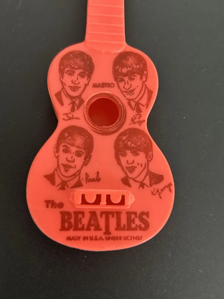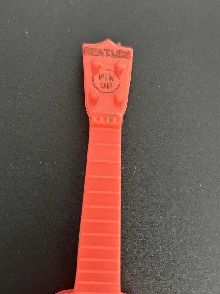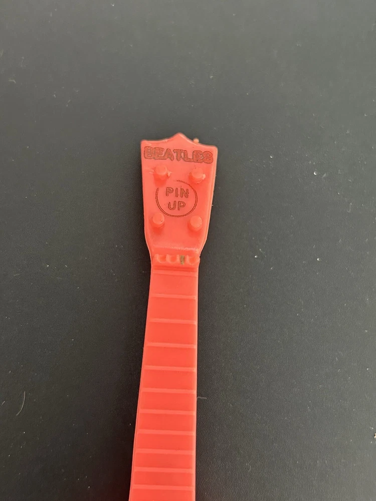 Rare Vintage Beatles Guitar Toy 1964 Approx.5 inches long. A very cool hard to find little guitar and in great condition. Please look at the pictures ask any questions The 5 inch plastic guitar has a clip on the back you can clip to your lapel or pocket. I have had these over the years and they never came with strings. This is an original vintage from 1964 era. Selling “As Is” NO RETURNS Made in U.S.A. Under License. Any questions please message me