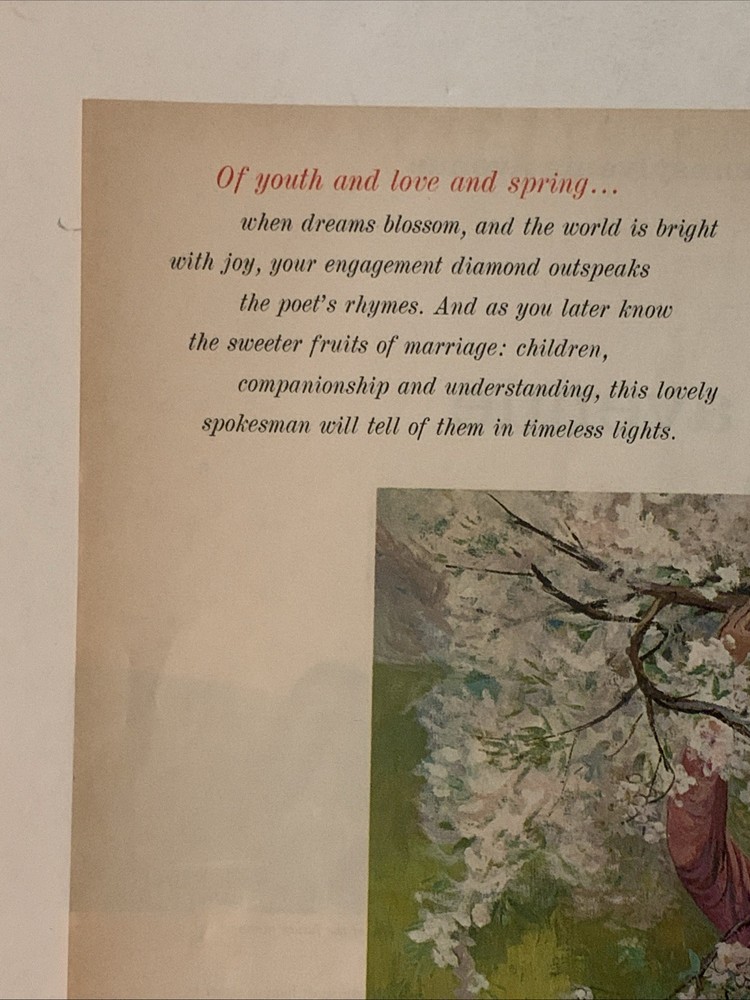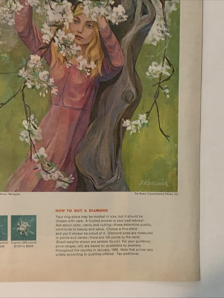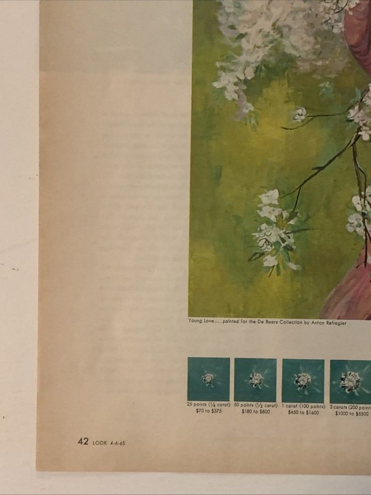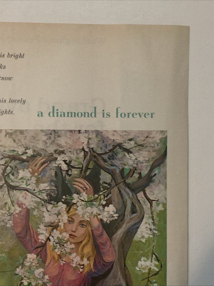 The product is a vintage magazine print ad from De Beers featuring a young love story titled "A Diamond Is Forever." Created in 1965 in the United States, the ad showcases a multi-color design with a page measurement of approximately 10"x14". This collectible piece of advertising memorabilia captures a romantic sentiment associated with De Beers diamond marketing campaigns.