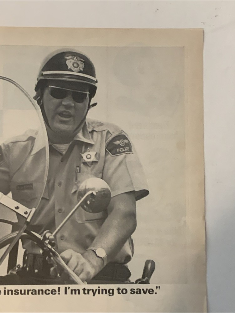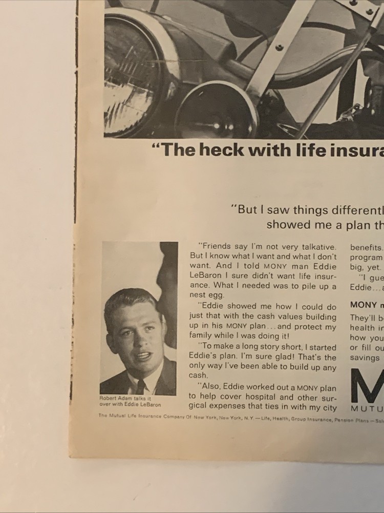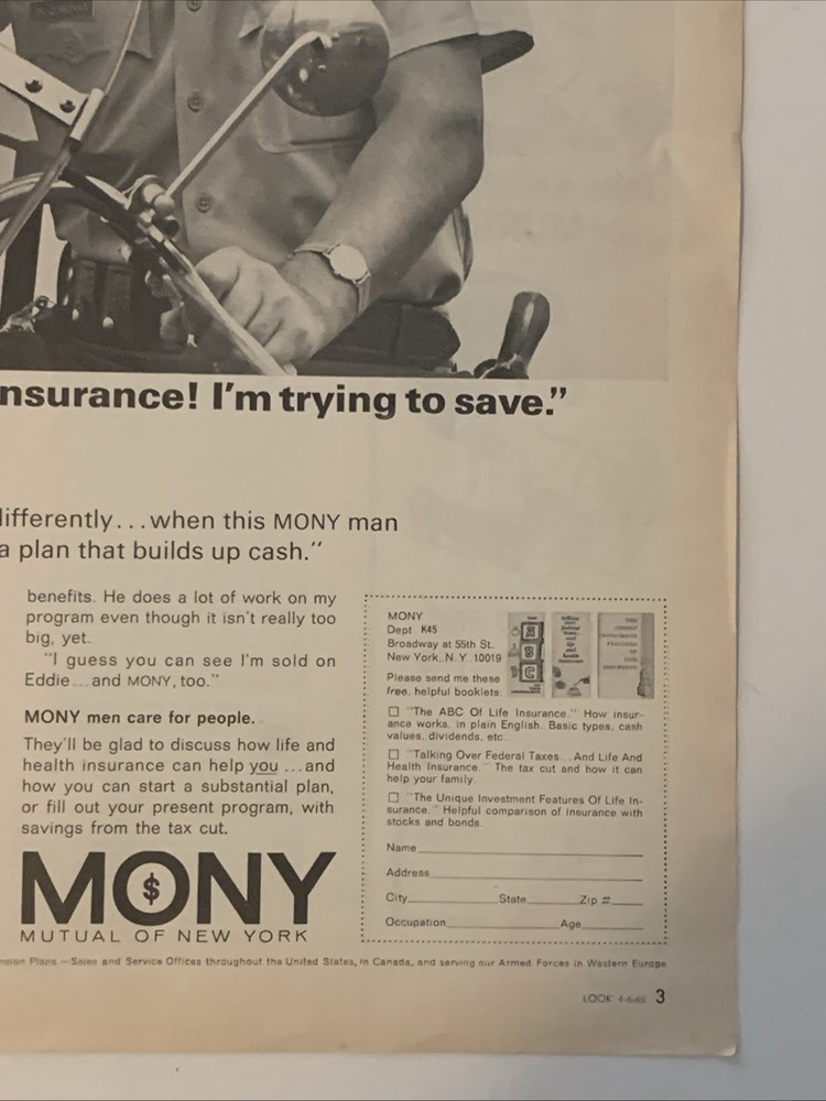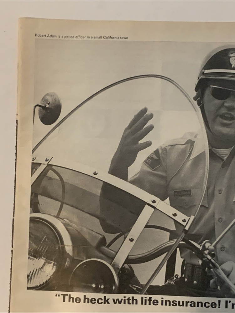 The product is a vintage magazine print ad from 1965 featuring Robert Adam, a police officer in a small California town. The ad is in black and white, showcasing the brand Mutual of New York. The ad measures approximately 10"x14" and was created in the United States. This collectible piece offers a glimpse into insurance advertising of the 1960s.