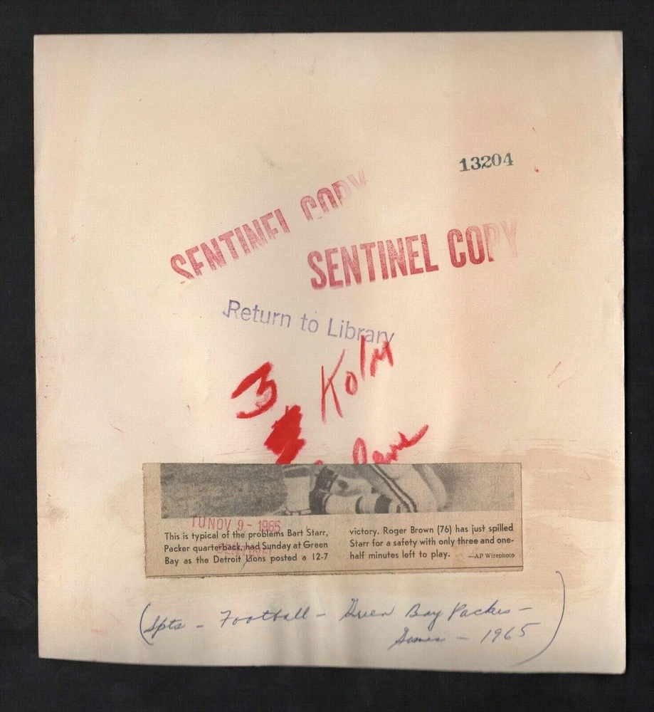 Note: Please study the images carefully to determine the condition of this vintage photograph, as it may not be in perfect condition. It may contain wrinkles, cracks, and possibly even tears due to its age and how it was handled before it got to us. A scanner may interpret colors and contrast differently than human eyes will, so it is possible that the actual photograph may be slightly darker or lighter in person. This vintage photograph is offered for sale as a collectible item and conveys no transfer of copyright. 8x 8 1/2 1965 Press Photo Bart Starr Green Bay Packers vs Roger Brown Detroit Lions $4.99 SHIPPING NO MATTER HOW MANY PHOTOS BOUGHT PER INVOICE