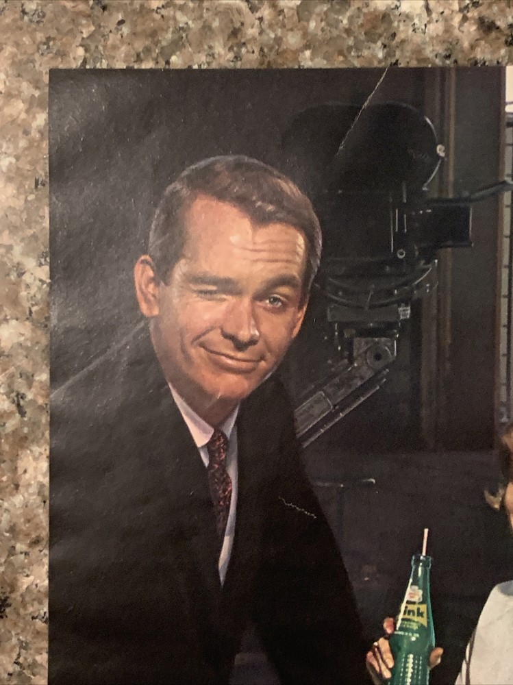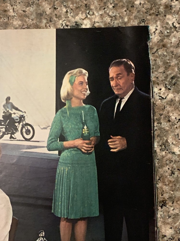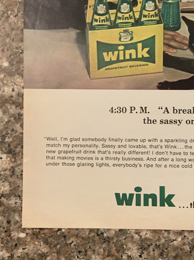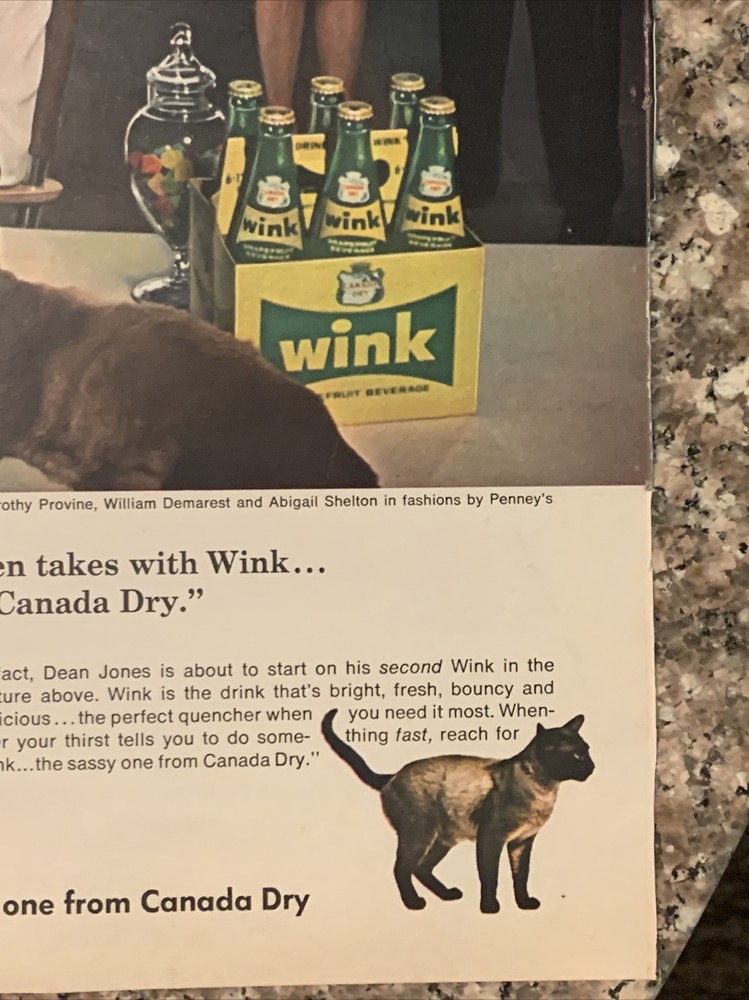 This vintage print ad from 1965 features actor Dean Jones holding a bottle of Canada Dry Wink Grapefruit soda, with his co-stars from the movie "That Darn Cat". The colorful ad showcases the iconic brand logo and highlights the refreshing taste of the soda. The ad is a great addition to any soda or vintage advertising collection, and is an original piece straight from the United States. Don't miss out on the opportunity to own a piece of soda history! Original approximate 10”x13.5” vintage magazine print ad.