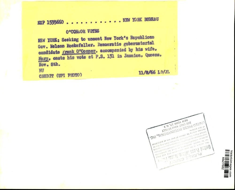 ebay template Note: Please study the images carefully to determine the condition of this vintage photograph, as it may not be in perfect condition. It may contain wrinkles, cracks, and possibly even tears due to its age and how it was handled before it got to us. A scanner may interpret colors and contrast differently than human eyes will, so it is possible that the actual photograph may be slightly darker or lighter in person. This vintage photograph is offered for sale as a collectible item and conveys no transfer of copyright. 1966 Press Photo Candidate Frank O'Connor and wife Mary vote in New York This is an original press photo. New York. Seeking to unseat New York's Republican Governor Nelson Rockefeller, Democratic gubernatorial candidate Frank O'Connor, accompanied by his wife, Mary, casts his vote at P.S. 131 in Jamaica, Queens, November 8.Photo measures 9.75 x 8inches. Photo is dated 11-08-1966. PHOTO FRONT PHOTO BACK Historic Images Part Number: kfa27682 FAQs Q: Can I just download a digital version instead? A: No, we sell only vintage originals and do not make or distribute any copies, including digital ones. Q: Do you combine shipping and invoices? A: Multiple photos won on the same seller ID combine automatically through the eBay checkout process. If you encounter problems with this, send us a message via eBay messaging and we will send you an invoice. Due to eBay limitations, we cannot combine items won on our different seller IDs for a single shipping charge. Q: How quickly do you ship the items once paid? A: We ship within one business day after your payment clears. If you do not receive an "order shipped" email from us by the close of the second business day from submitting payment, please e-mail us via eBay messaging. Q: How do you make sure my photograph arrives safely? A: We package each order between two cross-corrugated pieces of cardboard to ensure that the package is as difficult to bend as possible. We then wrap each order in a plastic sheet to help protect against moisture. We want you to rest assured that we take every precaution to ensure that the photograph you receive will be in the same condition in your care as it was in ours. Q: Will the "Historic Images" watermark be on my photo when I receive it? A: No. This is a digital watermark we use to protect our images. It is not printed on the photo. Q: What are your office hours? A: eBay for us is a business, and a very fun one to be in! We are open M-F 9 to 5 (CST). Therefore, we do not return e-mails and phone calls over the weekend. We observe the following holidays: New Years Day, Memorial Day, Fourth of July, Labor Day, Thanksgiving and the day after Thanksgiving, Christmas Eve and Christmas Day. Q: Where did all these vintage photos come from? A: These original vintage photographs are from various news service and newspaper photo archives from locations around the country including: Boston, Detroit, Tampa, Chicago, Denver, Seattle, New Orleans, Milwaukee, Portland, Spokane, and more. We do not copy or reproduce any photographs -- every item is a unique vintage piece that was housed in a news archive. Q: Can I use this photograph in my book/blog/website? A: The short answer is no. There is no transfer of copyright for republication or reproduction with these photographs when you purchase them, and only photographs taken before 1923 are currently automatically in the public domain. Permission from the copyright holder, which usually can be identified from the back of each photo, must be sought to republish or reproduce the image for any purpose. Q: Do you relist items (in case I miss an auction ending)? A: Auction items that receive no bids are relisted in our store (historicimages-store on eBay) as a fixed-price item and at a higher price than the starting auction price. Q: Do you leave feedback? A: Yes, we always leave feedback for buyers. Our software monitors when our buyers leave us feedback, then notifies us that we can leave feedback for the buyer. Rest assured, if you leave feedback, we will do the same! Check out our family of eBay IDs: historicimages01 Sports Photos historicimages02 Entertainment Photos historicimages03 Americana Photos historicimages04 International & War Photos historicimages05 Transportation Photos historicimages06 Photos of All Subjects historicimages07 Entertainment Photos historicimages08 Newsworthy Photos historicimages09 Entertainment Photos historicimages10 Sports Photos historicimages-store Our largest fixed-price selection historicimages-gallery Hand-picked photos Saturday night auctions About Us Historic Images was formed in September 2009, with a handful of scanners working out of a basement to digitize newspaper photo archives. We have since moved out of the basement, and we can now archive thousands of photos per day. Our company has worked with magazines and newspapers from Detroit, Boston, Denver, Seattle, Tampa, Chicago, and New Orleans, just to name a few. We are constantly adding to our inventory, and have assembled an archive of millions of photos to date. As our company evolved, we began our eBay business, which brings thousands of fresh auctions per week to the world's largest online auction marketplace. Our custom software systems and team of great employees allow us to efficiently scan and sell large photo archives online. At the very core of our company's DNA is a strong commitment to customer satisfaction and strict integrity for our product. Our promise to you is that we will do everything in our power to provide you a great buying experience. Copyright 2009 - Present, Historic Images, Inc. Sell Smarter with Kyozou. Inventory and Ecommerce Management