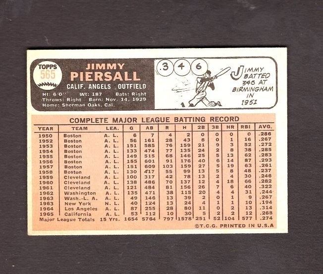 1966 Topps HIGH # 565 Jimmy Piersall in EX/MT condition - no creases. SHIPPING IS FREE. Please check out the many other Topps Baseball Stars & High # cards I have available in my e-bay store. If you think you might buy multiple items from any seller that offers combined shipping, use the "Add To Cart" option under the "Buy It Now" button instead of the buy-it-now, and this will combine your purchases into one shipping charge as you add more items to your cart and purchase. Only make your payment after you have added all the items you want into your cart - you should then see that there is one charge for shipping when you go to make your payment. . (jcm)