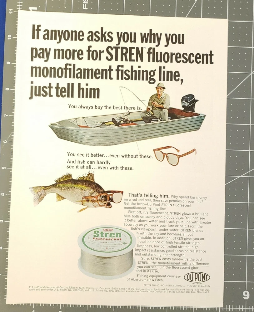 Perfect for framing. 1967 DUPONT STREN FISHING LINE Print Ad. FULL COLOR Collectible Cabin Fishing Art. Original 11"x8". This page is from a Vintage Magazine. The page is in good condition with light age toning. This is an original advertisement and not a reproduction. I carefully removed this from the magazine it was originally in. It will be stored and shipped in a plastic sleeve with a backing board. If you like this please check our other listings as we upload similar items daily.