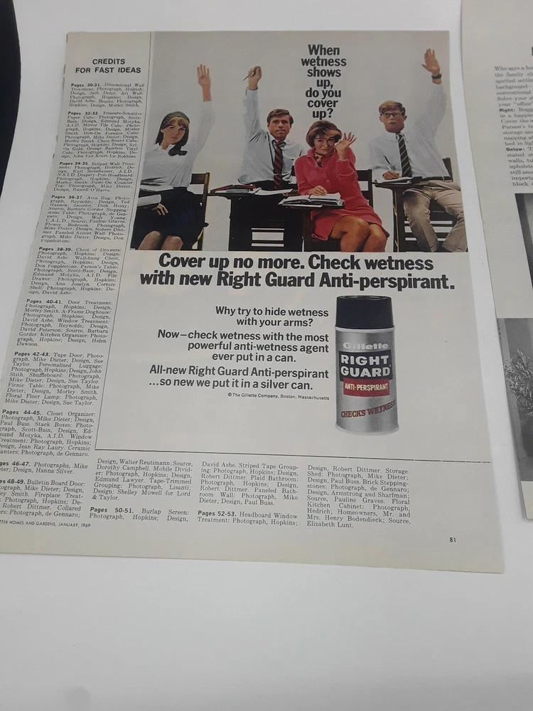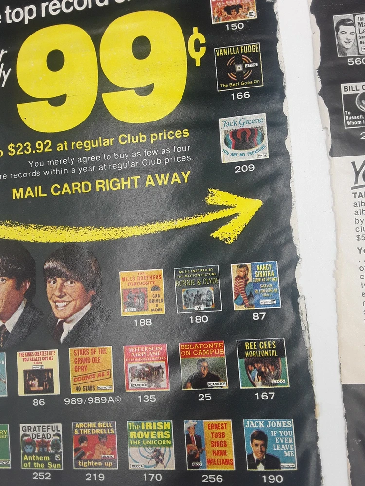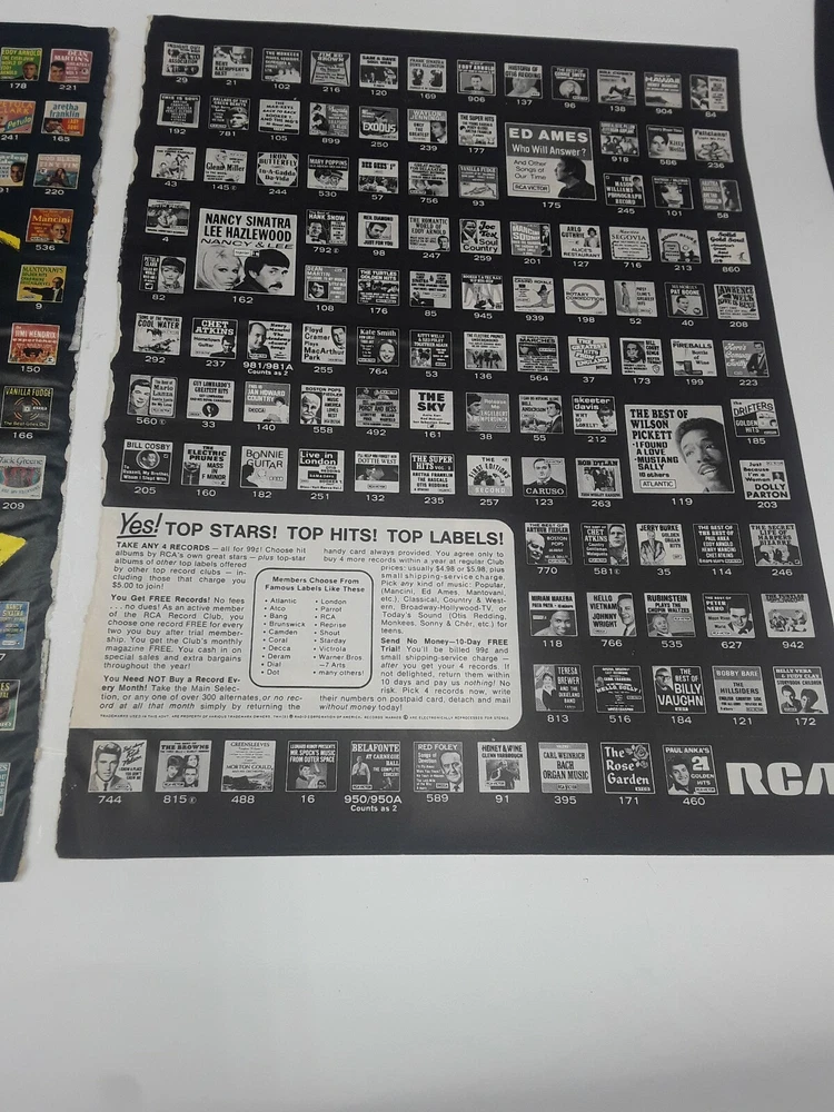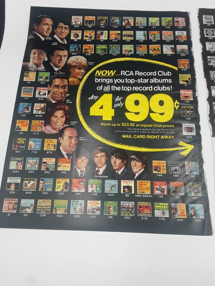 This is an original page from a 1968 magazine. One side is a color ad for RCA record club and pictures Frank Sinatra, Dean Martin, Lawrence Welk, Al Hirt, Loretta Lynn, Jim Reeves, Eddy Arnold, Henry Mancini and the Monkees. Also pictures 74 different record albums. The reverse side is a ad for Gillette Right Guard and the other page is article and photos for Home office. PAGE HAS A TEAR WHERE TAKEN OUT OF MAGAZINE AND GLUE STRIP FROM MAGAZINE. This is not tears in photo # 6 It is glue from magazine binding . SOME WRINKLES,LOOK AT PHOTOS AS THEY WILL SHOW CONDITION BEST. ads will be shipped between heavy cardboard.