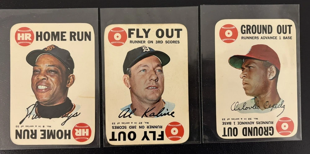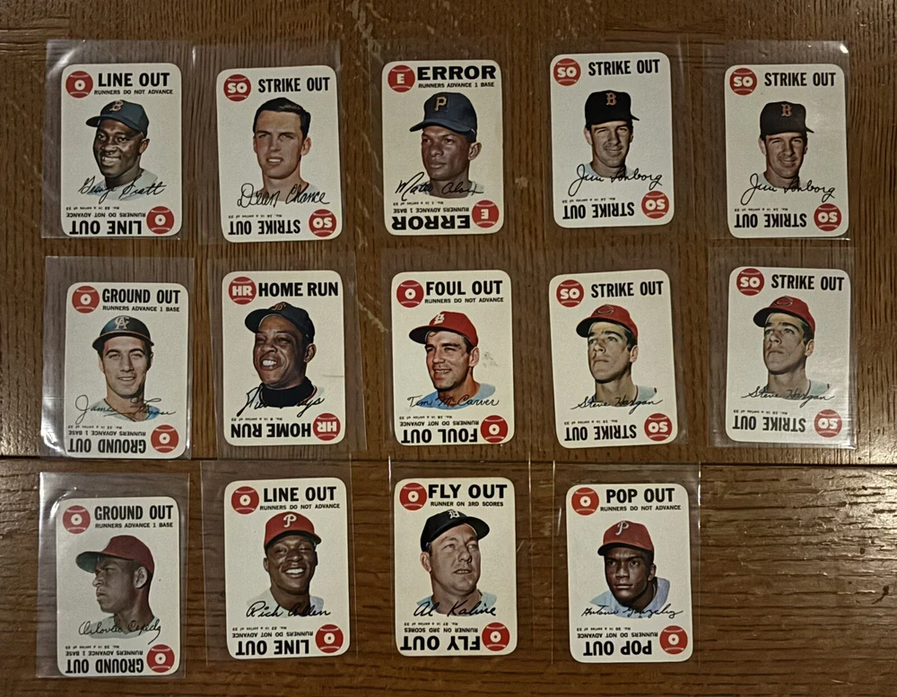 1968 Topps Baseball Game Cards 14 Card Lot Willie Mays (HOF) -- Card has discolored line. See photo. Al Kaline (HOF) Orlando Cepeda (HOF) George Scott Jim Fregosi Rich Allen Dean Chance Matty Alou Antonio Gonzales Jim Longborg (2) Steve Hargan (2)