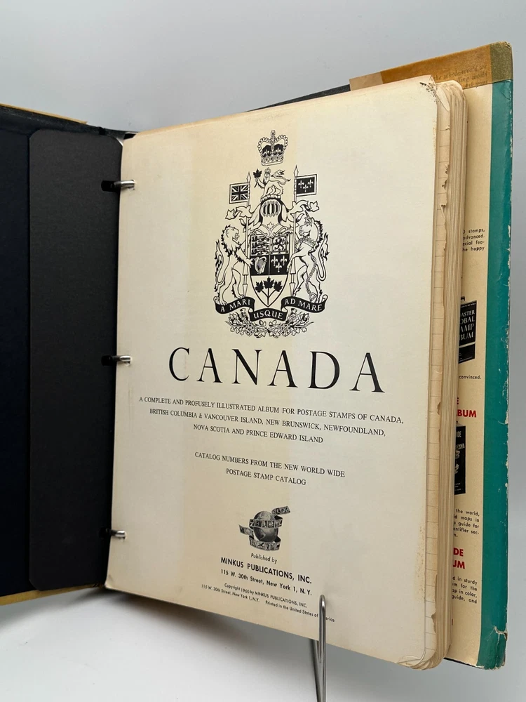 Discover the beauty of Canadian philately with this 1969 Minkus Canada Stamp Album, a comprehensive collector’s item for Canadian and provincial postage stamps. Profusely illustrated, this album is perfect for stamp collectors seeking a vintage piece to showcase their collection of Canadian stamps, including historical anniversaries and events. The binder format offers space to organize and display stamps with ease, while the classic cover design adds a touch of nostalgia to any collection. Perfect for history buffs and philatelists alike!