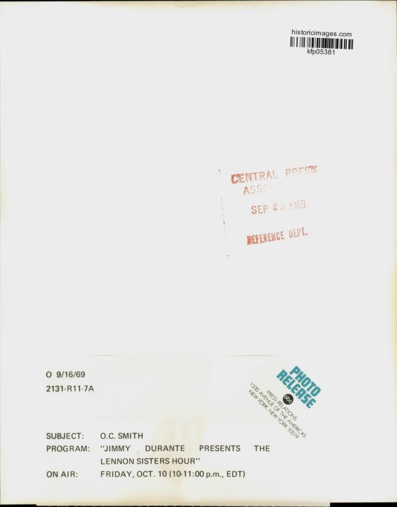 ebay template Note: Please study the images carefully to determine the condition of this vintage photograph, as it may not be in perfect condition. It may contain wrinkles, cracks, and possibly even tears due to its age and how it was handled before it got to us. A scanner may interpret colors and contrast differently than human eyes will, so it is possible that the actual photograph may be slightly darker or lighter in person. This vintage photograph is offered for sale as a collectible item and conveys no transfer of copyright. 1969 Press Photo O.C. Smith in "Jimmy Durante Presents Lennon Sisters Hour" This is an original press photo. O.C. Smith in "Jimmy Durante Presents Lennon Sisters Hour"Photo measures 7.5 x 9.5inches. Photo is dated 09-16-1969. PHOTO FRONT PHOTO BACK Historic Images Part Number: kfp05381 FAQs Q: Can I just download a digital version instead? A: No, we sell only vintage originals and do not make or distribute any copies, including digital ones. Q: Do you combine shipping and invoices? A: Multiple photos won on the same seller ID combine automatically through the eBay checkout process. If you encounter problems with this, send us a message via eBay messaging and we will send you an invoice. Due to eBay limitations, we cannot combine items won on our different seller IDs for a single shipping charge. Q: How quickly do you ship the items once paid? A: We ship within one business day after your payment clears. If you do not receive an "order shipped" email from us by the close of the second business day from submitting payment, please e-mail us via eBay messaging. Q: How do you make sure my photograph arrives safely? A: We package each order between two cross-corrugated pieces of cardboard to ensure that the package is as difficult to bend as possible. We then wrap each order in a plastic sheet to help protect against moisture. We want you to rest assured that we take every precaution to ensure that the photograph you receive will be in the same condition in your care as it was in ours. Q: Will the "Historic Images" watermark be on my photo when I receive it? A: No. This is a digital watermark we use to protect our images. It is not printed on the photo. Q: What are your office hours? A: eBay for us is a business, and a very fun one to be in! We are open M-F 9 to 5 (CST). Therefore, we do not return e-mails and phone calls over the weekend. We observe the following holidays: New Years Day, Memorial Day, Fourth of July, Labor Day, Thanksgiving and the day after Thanksgiving, Christmas Eve and Christmas Day. Q: Where did all these vintage photos come from? A: These original vintage photographs are from various news service and newspaper photo archives from locations around the country including: Boston, Detroit, Tampa, Chicago, Denver, Seattle, New Orleans, Milwaukee, Portland, Spokane, and more. We do not copy or reproduce any photographs -- every item is a unique vintage piece that was housed in a news archive. Q: Can I use this photograph in my book/blog/website? A: The short answer is no. There is no transfer of copyright for republication or reproduction with these photographs when you purchase them, and only photographs taken before 1923 are currently automatically in the public domain. Permission from the copyright holder, which usually can be identified from the back of each photo, must be sought to republish or reproduce the image for any purpose. Q: Do you relist items (in case I miss an auction ending)? A: Auction items that receive no bids are relisted in our store (historicimages-store on eBay) as a fixed-price item and at a higher price than the starting auction price. Q: Do you leave feedback? A: Yes, we always leave feedback for buyers. Our software monitors when our buyers leave us feedback, then notifies us that we can leave feedback for the buyer. Rest assured, if you leave feedback, we will do the same! Check out our family of eBay IDs: historicimages01 Sports Photos historicimages02 Entertainment Photos historicimages03 Americana Photos historicimages04 International & War Photos historicimages05 Transportation Photos historicimages06 Photos of All Subjects historicimages07 Entertainment Photos historicimages08 Newsworthy Photos historicimages09 Entertainment Photos historicimages10 Sports Photos historicimages-store Our largest fixed-price selection historicimages-gallery Hand-picked photos Saturday night auctions About Us Historic Images was formed in September 2009, with a handful of scanners working out of a basement to digitize newspaper photo archives. We have since moved out of the basement, and we can now archive thousands of photos per day. Our company has worked with magazines and newspapers from Detroit, Boston, Denver, Seattle, Tampa, Chicago, and New Orleans, just to name a few. We are constantly adding to our inventory, and have assembled an archive of millions of photos to date. As our company evolved, we began our eBay business, which brings thousands of fresh auctions per week to the world's largest online auction marketplace. Our custom software systems and team of great employees allow us to efficiently scan and sell large photo archives online. At the very core of our company's DNA is a strong commitment to customer satisfaction and strict integrity for our product. Our promise to you is that we will do everything in our power to provide you a great buying experience. Copyright 2009 - Present, Historic Images, Inc. Sell Smarter with Kyozou. Inventory and Ecommerce Management