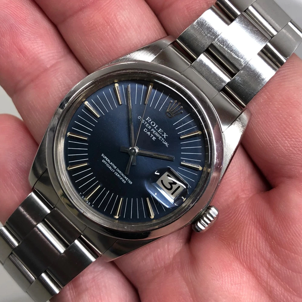 Manufacturer: Rolex Model Name: Date Ref #, Serial #, Circa: 1500, 278XXXX, 1971 Case: Stainless Steel Oyster Case Movement: Oyster Caliber 1570 Automatic Movement Case Dimensions: 34mm excluding Crown Bracelet: Stainless Steel Oyster Bracelet Dial: T Swiss Made T Signed Blue Radial Dial Bezel: Stainless Steel Smooth Bezel Accessories: None 100% Authentic! Description: A highly attractive and beautiful 1971 Rolex Date 1500 Radial Dial Stainless Steel Automatic Wristwatch. Stainless steel Oyster case is great and has remained thick and full bodied. Some light natural wear in keeping with age and usage. Original and very rare radial dial is very nice and has a slight violet hue. Some light wear in keeping with age and usage present. Luminescent plots reacts to UV light and fade at same pace. Stainless steel 78350 Oyster bracelet with 557B end pieces is great, includes 11 full links, and is date coded to 1995. Oyster Perpetual Caliber 1520 automatic movement is running and functioning. Any and All Questions Please Ask! International Buyers Please Inquire For Shipping. Sales Tax Applies eBay Regulated States. DISCLAIMER Five star feedback is greatly appreciated! I will always return the favor when 100% positive feedback has been received! If there is an issue please contact me and I will help you resolve the problem. I strive to keep my 100% rating so always contact me first! When you place a bid you are entering into a contract with myself (Hashtagwatchco). You are also agreeing to all terms listed in the auction or “Buy it Now” price. Failure to uphold the terms of the contract will result with you being notified to eBay and any other entity involved of said failure. All Items are sold AS-IS . If an item is being sold as “PRE-OWNED”, the item will have some signs of use and wear on it, I.E. scratches and marks. Anything mentioned in the text is considered disclosed to the buyer. You are responsible for reading the complete text, including this disclaimer. Anything visible in the images is considered disclosed to the buyer. You are responsible for viewing and enlarging all images. The photographs are NEVER edited. Unedited photographs often disclose condition far better than verbiage as many people have different ideas on what terms may mean. You have enlarged the full set of complementary photographs. Our images are unedited in order to represent the item as accurately as possible to the buyer. Images disclose identifying marks, inclusions or defects. As per the responsibility of the buyer, you have three (3) days from date of delivery to fully inspect the item and ensure it is as described. If there is no communication of any kind after the third day we will accept the fact that you are happy with the item. Whether feedback is left or not, we will accept the fact that the item was delivered and inspected successfully by the buyer within the inspection timeframe. We do not guarantee waterproofness on pre-owned watches. If you have any questions over an item please message me BEFORE you place a bid or purchase an item. Shipping: I will ship the item out within the stated handling time and one day of cleared payment. Shipping prices are to cover the costs of insurance and possible signature confirmations. I normally ship higher price items via UPS Next Day or 2nd day Air. I am not responsible for any customs or duty fees/ delays in customs checks. Any item purchased internationally that exceeds 250.00 USD including the shipping cost must have a signature confirmation. I can only use UPS services for anything over 250.00USD internationally. If you opt out of the signature confirmation and would like to use USPS to keep the shipping cost lower you wave all insurances, lost packages, and damage to the given item. I will not be held responsible for the given reasons or other reasons that could possibly come up. I am not affiliated in any way with any of the brands presented.