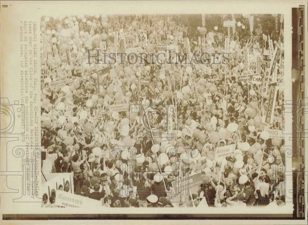 ebay template Note: Please study the images carefully to determine the condition of this vintage photograph, as it may not be in perfect condition. It may contain wrinkles, cracks, and possibly even tears due to its age and how it was handled before it got to us. A scanner may interpret colors and contrast differently than human eyes will, so it is possible that the actual photograph may be slightly darker or lighter in person. This vintage photograph is offered for sale as a collectible item and conveys no transfer of copyright. 1972 Press Photo Delegates celebrate the nomination of President Nixon, Florida This is an original press photo. Miami Beach, Florida - Fedlam takes over on the floor of the Republican National Convention Tuesday night as delegates celebrate the nomination of President Nixon for a second term.Photo measures 11 x 8inches. Photo is dated 8-23-1972. PHOTO FRONT PHOTO BACK Historic Images Part Number: lra66876 FAQs Q: Can I just download a digital version instead? A: No, we sell only vintage originals and do not make or distribute any copies, including digital ones. Q: Do you combine shipping and invoices? A: Multiple photos won on the same seller ID combine automatically through the eBay checkout process. If you encounter problems with this, send us a message via eBay messaging and we will send you an invoice. Due to eBay limitations, we cannot combine items won on our different seller IDs for a single shipping charge. Q: How quickly do you ship the items once paid? A: We ship within one business day after your payment clears. If you do not receive an "order shipped" email from us by the close of the second business day from submitting payment, please e-mail us via eBay messaging. Q: How do you make sure my photograph arrives safely? A: We package each order between two cross-corrugated pieces of cardboard to ensure that the package is as difficult to bend as possible. We then wrap each order in a plastic sheet to help protect against moisture. We want you to rest assured that we take every precaution to ensure that the photograph you receive will be in the same condition in your care as it was in ours. Q: Will the "Historic Images" watermark be on my photo when I receive it? A: No. This is a digital watermark we use to protect our images. It is not printed on the photo. Q: What are your office hours? A: eBay for us is a business, and a very fun one to be in! We are open M-F 9 to 5 (CST). Therefore, we do not return e-mails and phone calls over the weekend. We observe the following holidays: New Years Day, Memorial Day, Fourth of July, Labor Day, Thanksgiving and the day after Thanksgiving, Christmas Eve and Christmas Day. Q: Where did all these vintage photos come from? A: These original vintage photographs are from various news service and newspaper photo archives from locations around the country including: Boston, Detroit, Tampa, Chicago, Denver, Seattle, New Orleans, Milwaukee, Portland, Spokane, and more. We do not copy or reproduce any photographs -- every item is a unique vintage piece that was housed in a news archive. Q: Can I use this photograph in my book/blog/website? A: The short answer is no. There is no transfer of copyright for republication or reproduction with these photographs when you purchase them, and only photographs taken before 1923 are currently automatically in the public domain. Permission from the copyright holder, which usually can be identified from the back of each photo, must be sought to republish or reproduce the image for any purpose. Q: Do you relist items (in case I miss an auction ending)? A: Auction items that receive no bids are relisted in our store (historicimages-store on eBay) as a fixed-price item and at a higher price than the starting auction price. Q: Do you leave feedback? A: Yes, we always leave feedback for buyers. Our software monitors when our buyers leave us feedback, then notifies us that we can leave feedback for the buyer. Rest assured, if you leave feedback, we will do the same! Check out our family of eBay IDs: historicimages01 Sports Photos historicimages02 Entertainment Photos historicimages03 Americana Photos historicimages04 International & War Photos historicimages05 Transportation Photos historicimages06 Photos of All Subjects historicimages07 Entertainment Photos historicimages08 Newsworthy Photos historicimages09 Entertainment Photos historicimages10 Sports Photos historicimages-store Our largest fixed-price selection historicimages-gallery Hand-picked photos Saturday night auctions About Us Historic Images was formed in September 2009, with a handful of scanners working out of a basement to digitize newspaper photo archives. We have since moved out of the basement, and we can now archive thousands of photos per day. Our company has worked with magazines and newspapers from Detroit, Boston, Denver, Seattle, Tampa, Chicago, and New Orleans, just to name a few. We are constantly adding to our inventory, and have assembled an archive of millions of photos to date. As our company evolved, we began our eBay business, which brings thousands of fresh auctions per week to the world's largest online auction marketplace. Our custom software systems and team of great employees allow us to efficiently scan and sell large photo archives online. At the very core of our company's DNA is a strong commitment to customer satisfaction and strict integrity for our product. Our promise to you is that we will do everything in our power to provide you a great buying experience. Copyright 2009 - Present, Historic Images, Inc. Sell Smarter with Kyozou. Inventory and Ecommerce Management