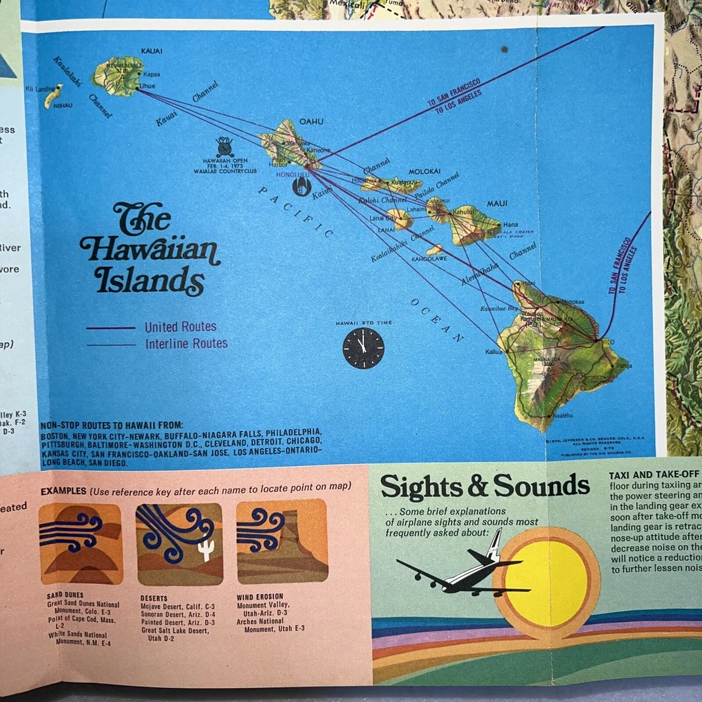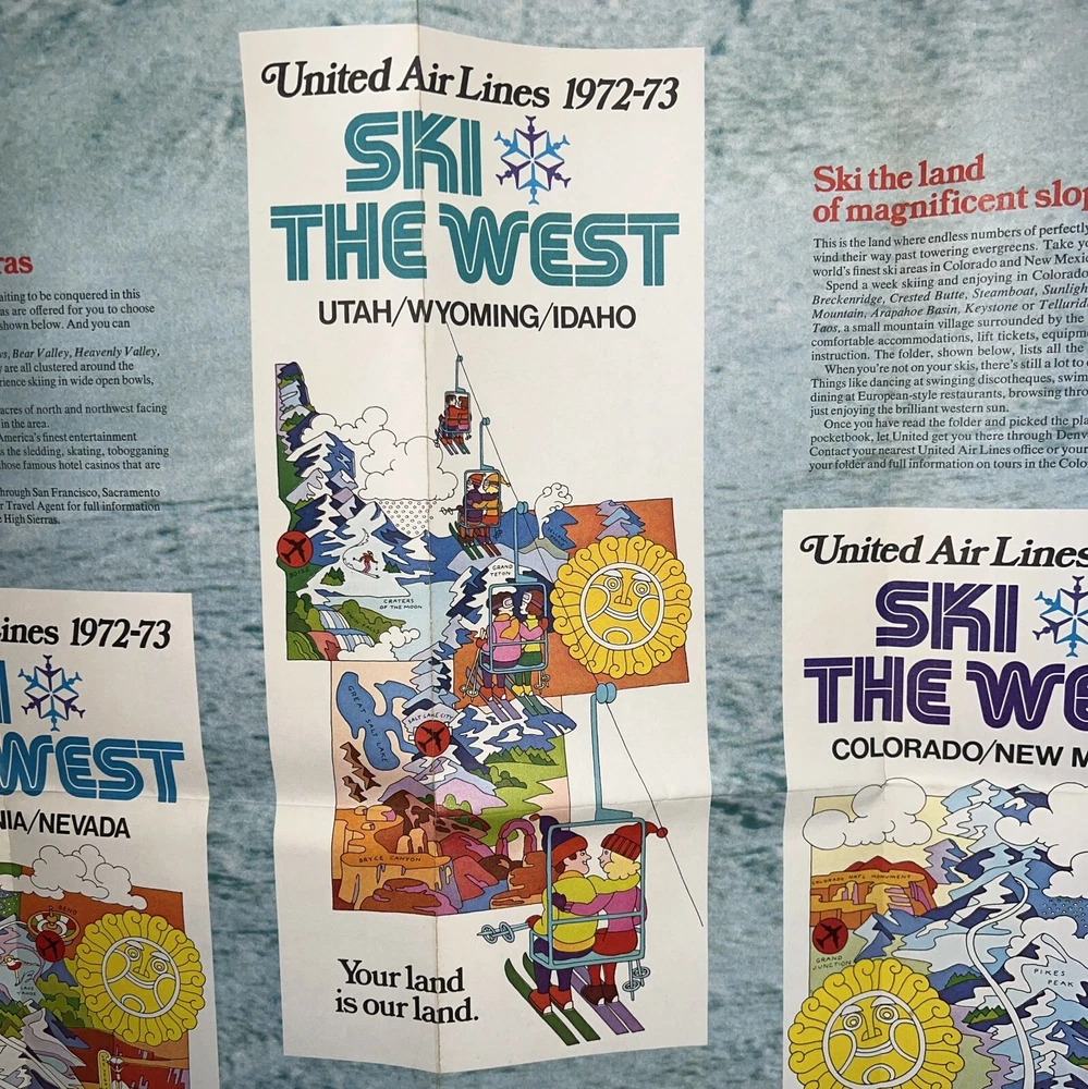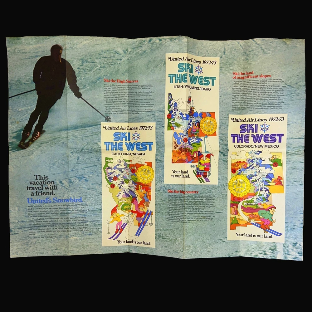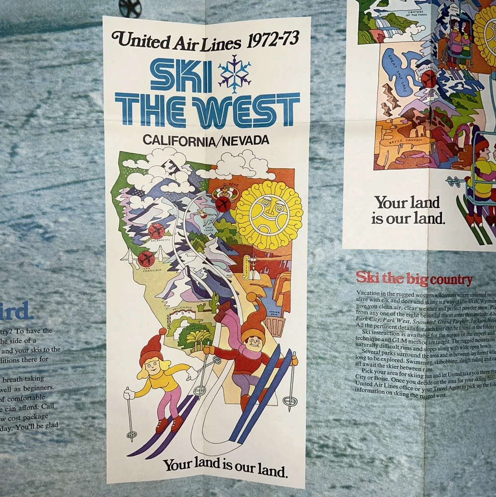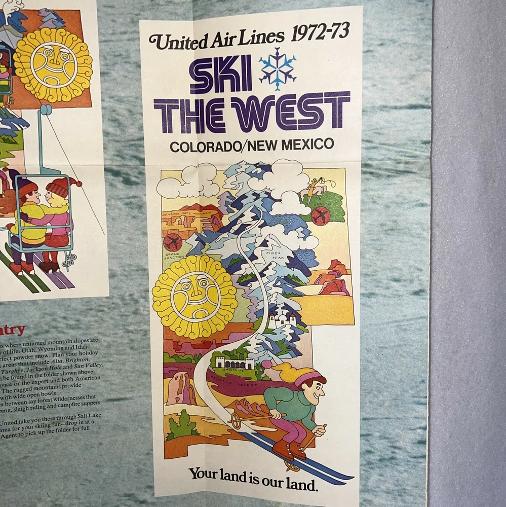 1972 United Air Lines "The Friendly Skies Air Atlas" Full Color US Map w Ski The West Poster on back - 21x34 inches Item: United Air Lines Air Atlas Full Color US Map w Ski West Poster on bk Year: 1972 Location: United States Measurements: Folded: approx. 6"x10.5" Open: approx. 21"x34" Notable Features: Full Color early 70s era Many interesting sections both Poster and Map Check out our other interesting items !