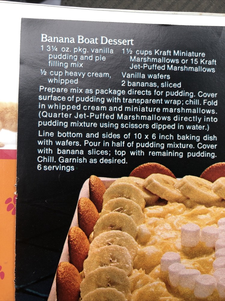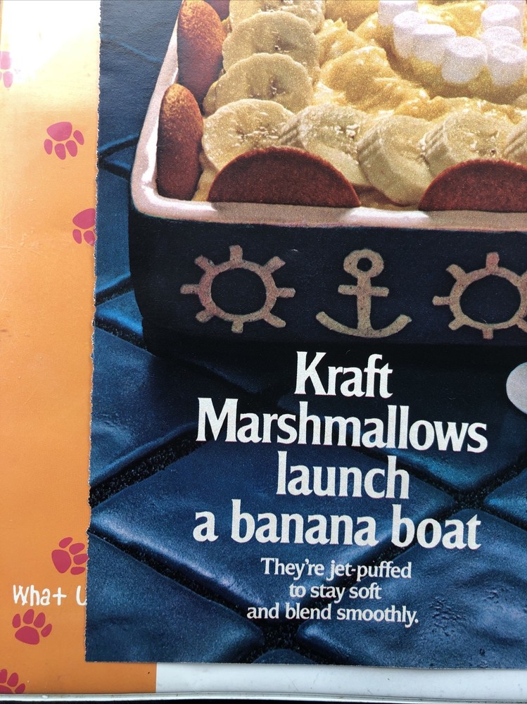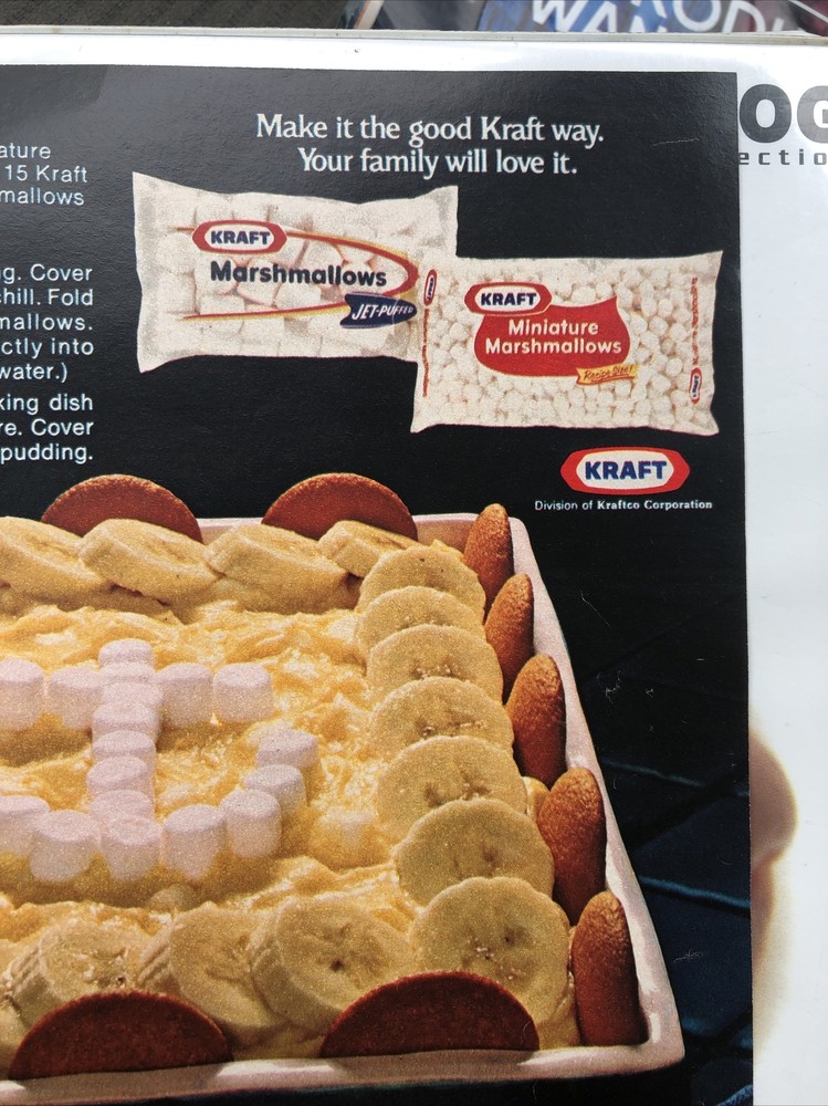 This vintage 1974 print ad features a mouth-watering banana boat dessert recipe using Kraft marshmallows. The colorful ad showcases the Jet-Puffed marshmallows and their versatility in creating delicious desserts. The ad is in great shape and would make a wonderful addition to any food and beverage advertising collection. The ad was originally published in a magazine and is an original piece from the United States. Original approximate 8"x11" vintage magazine print ad.