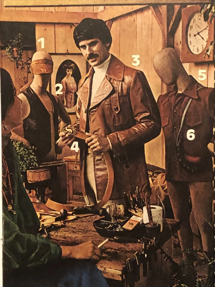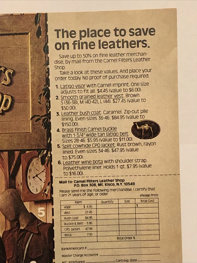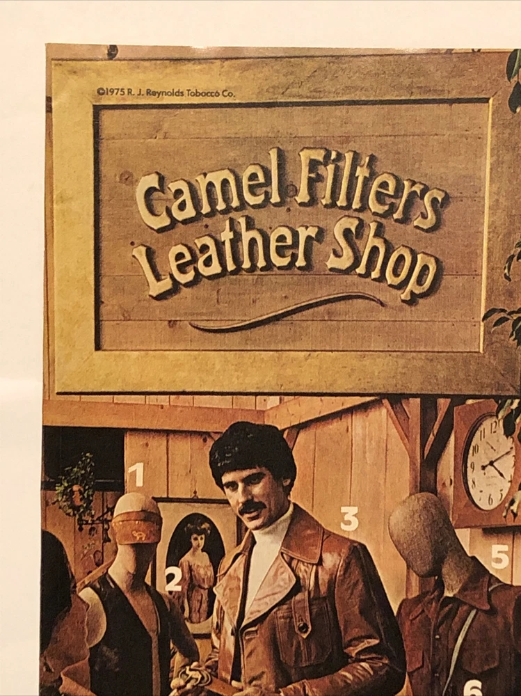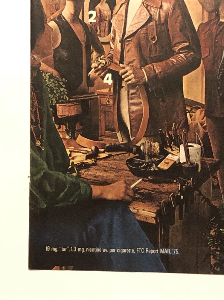 This vintage print ad from 1975 features a striking design showcasing Camel Filters cigarettes. The ad promotes a mail order offer for leather shop products and is perfect for collectors of advertising memorabilia. The ad was created in the United States during the 1970s and features the iconic Camel brand. The ad is a great addition to any collection, especially for those interested in vintage cigarette advertising. The colorful multi-color design is eye-catching and the ad would look great framed or displayed in any advertising collection. Don't miss out on this unique piece of Americana history. Original approximate 8”x11” vintage magazine print ad.