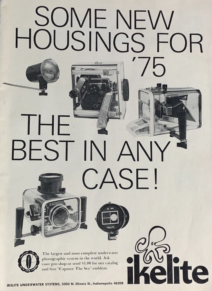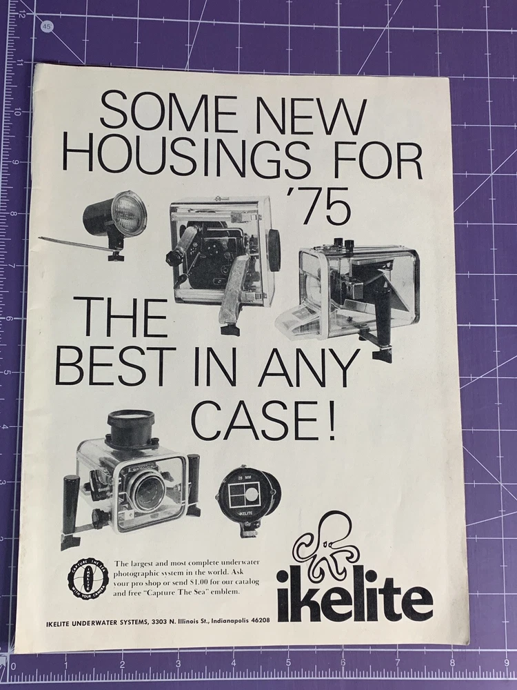 1975 PRINT AD IKELITE UNDERWATER SYSTEMS NEW CAMERA HOUSINGS FOR '75 This item was found at auction and there may be some staining, discoloration and other signs of age and use. Please see detailed photos for condition. **Photos are the item being sold.** Click Here to Visit my eBay Store