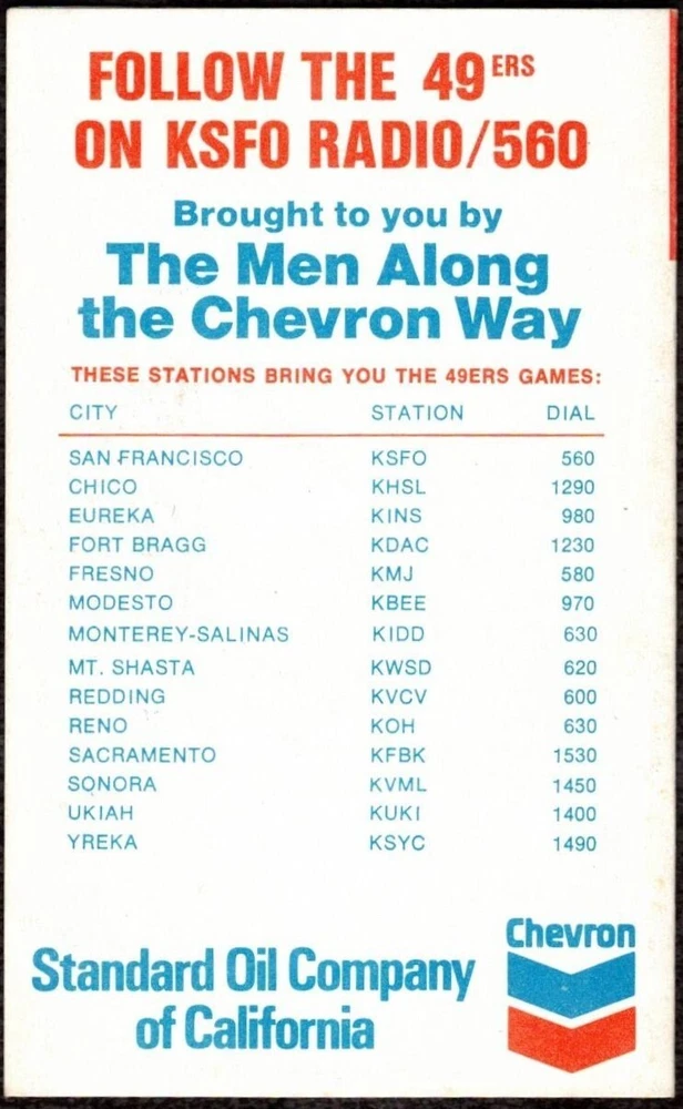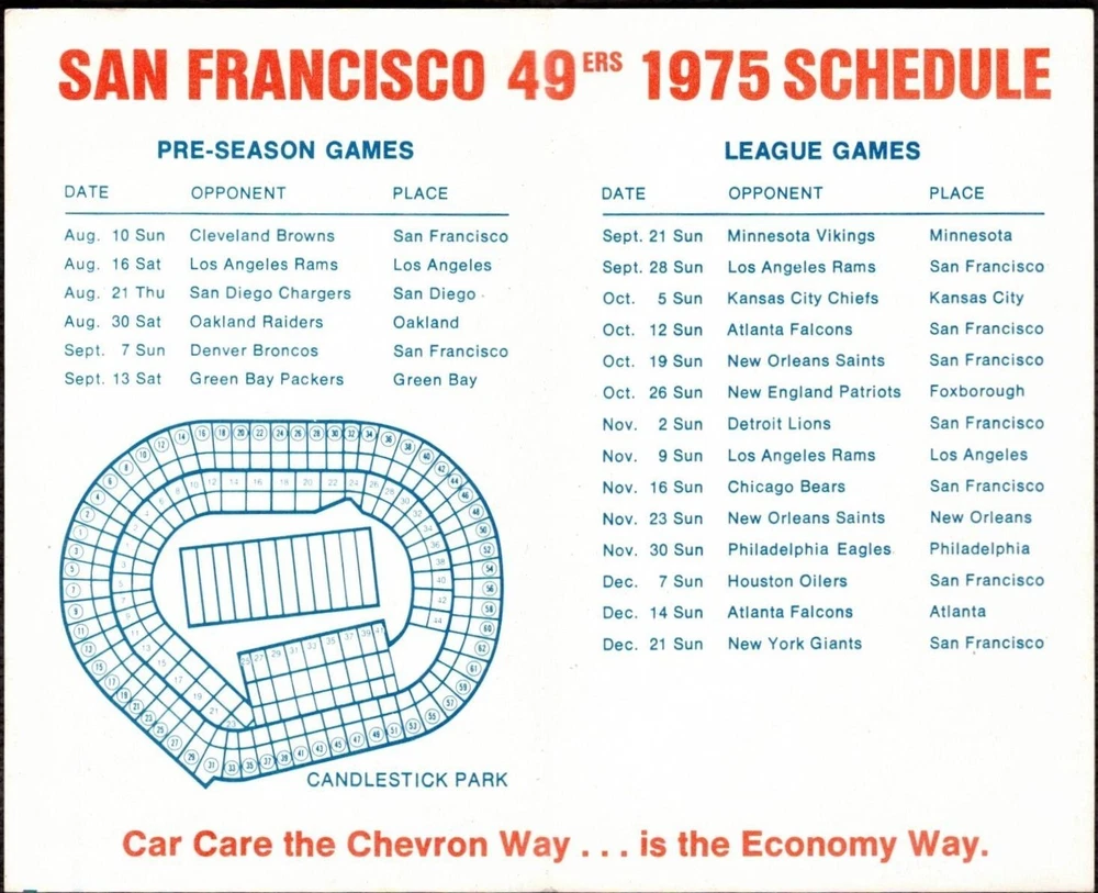 1975 San Francisco 49ers pocket schedule sponsored by Chevron / Standard Oil If there is a problem, please contact me before leaving negative feedback or contacting Ebay. I will do everything I possibly can to make it right. I will leave positive feedback as soon as payment is made. I would appreciate the same if you are satisfied. I will combine shipping for multiple items won. If you win multiple items I will then send a combined shipping invoice. My policy is to ship your item(s) same day or next day. I normally do not use tracking unless it is a high dollar item to try and keep down costs for the buyer. USPS does not have enough workers and it is causing delays on items arriving. I have had several items that have taken as long as 3 weeks to arrive. I assure you I am shipping the items out in a timely manner. I ask for your patience on receiving the items. Thank you