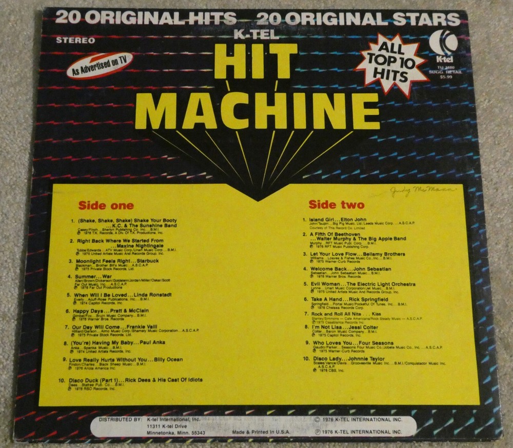 ON THE K-TEL LABEL Bid now on this vinyl record featuring Rick Dees' Disco Duck, Elton's Island Girl, Kiss' Rock and Roll All Nite, Electric Light Orchestra's Evil Woman and more, as pictured. record=VG+, cover=VG+ based upon Goldmine standards All maintained in a smoke-free environment THERE IS NO RESERVE FOR THIS ITEM Please add eBay calculated s&h that includes shipping materials, handling, required delivery confirmation and postage. Applicable sales tax will be automatically calculated and added by eBay. USE SHOPPING CART TO BUNDLE & SAVE=> s&h for each addl LP is only one dollar! P&E Enterprises celebrates 44 years of service!!! Thank you for bidding and good luck! All items are sold AS IS. There is no implied or specified warranty or guarantee to product performance on any used / opened item. Per eBAY policies, all questions regarding this item MUST be asked PRIOR to bidding and close of the item. blm
