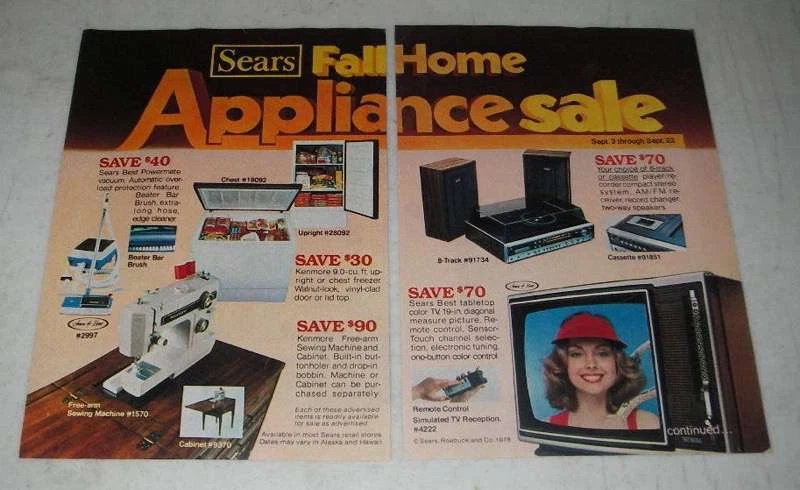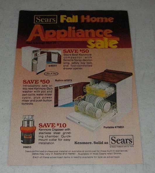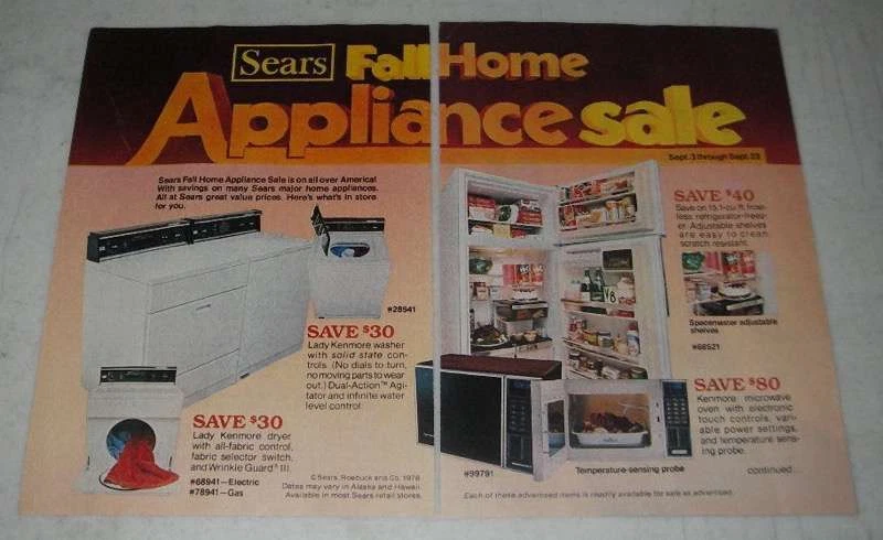 Item ID: Multi26 This listing is for a vintage paper advertisement. This is a 1978 5-page ad (3 pages total, 2 of them front/back) for Sears Appliances, featuring: Kenmore Washer #28941, Dryer #68941, Microwave #99791, Refrigerator #68521, Powermate Vacuum #2997, Chest Freezer #18092, Upright Freezer #28092, Free-Arm Sewing Machine #1570, Cabinet #9370, 8-Track #91734, Cassette #91851, TV #4222, Compactor #46911, Dishwasher #7973, Portable Dishwasher #79851 and Disposer #6653! The size of each page is approximately 5x7.5 inches. The caption for this ad is 'Sears Fall Home Appliance Sale' The ad is in good overall condition, with some light wear. This vintage ad would look great framed and displayed! Add it to your collection today!