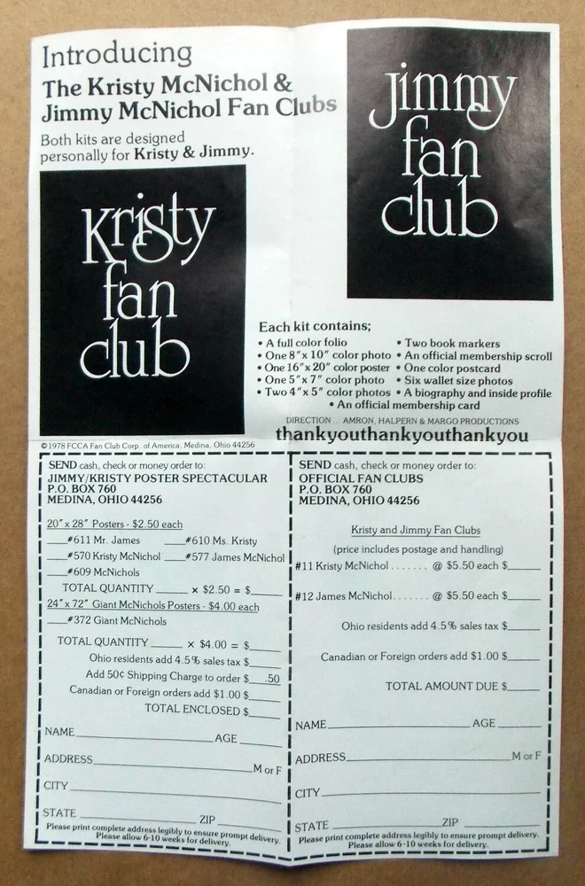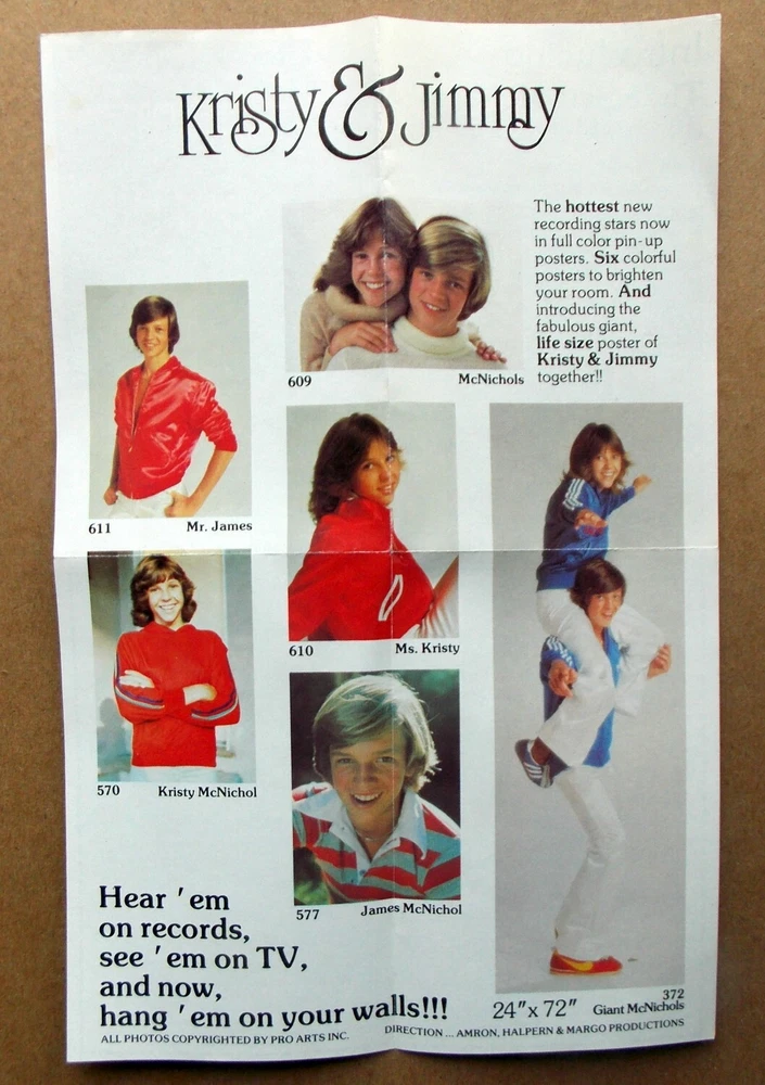 Welcome to TraderbyNature Visit our TraderbyNature Store!!! We have over 100 celebrity dolls & action figures from the 1960s-80s. We specialize in helping you find that last 1970s-80s BODY, HEAD or CLOTHING ACCESSORY to complete your doll or action figure. "1978 KRISTY & JIMMY MCNICHOL -- NEWEST TEENAGE RECORDING STARS -- POSTERS & FAN CLUB -- "ORIGINAL" ADVERTISEMENT -- 8 1/2 INCHES BY 5 1/2 INCHES" This listing is for the KRISTY & JIMMY MCNICHOL "ORIGINAL" ADVERTISEMENT ONLY . tbn663 This advertisement is one sheet of paper; our photos show the front and the back of the ad . This "original" advertisement is 8 1/2 inches by 5 1/2 inches and was given out with the 1978 Kristy McNichol doll. This item is in VERY GOOD CONDITION and taken RIGHT OUT OF THE BOX . We are not an action figure or television memorabilia expert. We are selling in "AS IS" condition, but please, feel free to "ASK US" any questions you might have on this item.