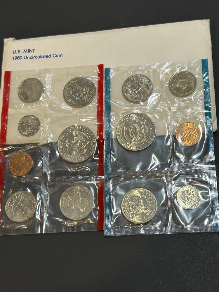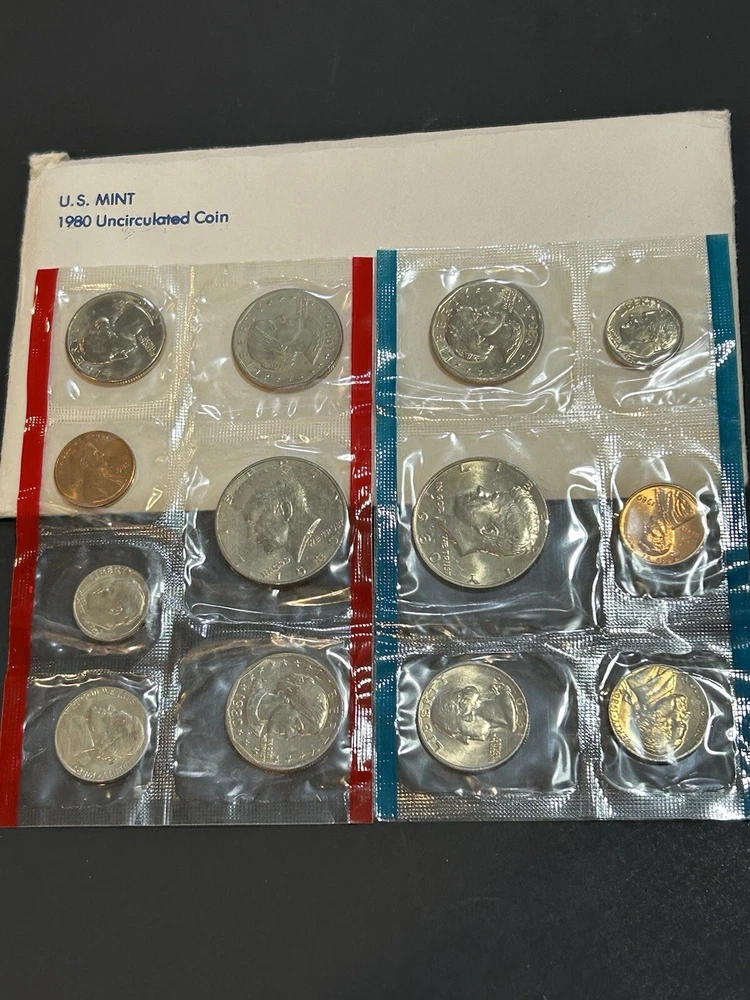 This 1980 P and D US Mint Uncirculated Coin Set is a great addition to any coin collection. The set includes $1 denomination coins that were minted in the United States and have not been circulated. The coins were struck in a business style and are ungraded. The set comes with certification from the U.S. Mint, ensuring its authenticity. This is a rare opportunity to own a piece of American history. Don't miss out on the chance to add this unique coin set to your collection.