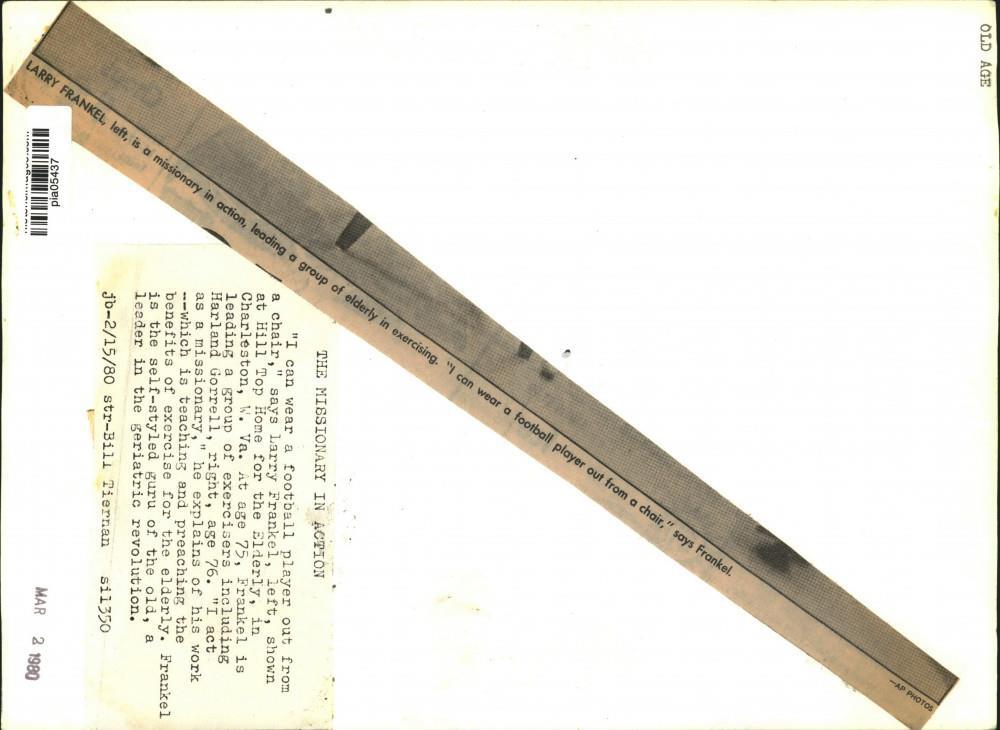 ebay template Note: Please study the images carefully to determine the condition of this vintage photograph, as it may not be in perfect condition. It may contain wrinkles, cracks, and possibly even tears due to its age and how it was handled before it got to us. A scanner may interpret colors and contrast differently than human eyes will, so it is possible that the actual photograph may be slightly darker or lighter in person. This vintage photograph is offered for sale as a collectible item and conveys no transfer of copyright. 1980 Press Photo Larry Frankel & Harland Cornell exercise at elderly home in WV This is an original press photo. Old Age. "I can wear a football player out from a chair," says Larry Frankel, left, shown at Hill Top Home for the Elderly, in Charleston, West Virginia. At age 75, Frankel is leading a group of exercisers including Harland Cornell, right, age 76. "I act as a missionary," he explains of his work —which is teaching and preaching the benefits of exercise for the elderly. Frankel is the self-styled guru of the old, a leader in the geriatric revolution.Photo measures 11 x 8.25inches. Photo is dated 2-15-1980. PHOTO FRONT PHOTO BACK Historic Images Part Number: pia05437 FAQs Q: Can I just download a digital version instead? A: No, we sell only vintage originals and do not make or distribute any copies, including digital ones. Q: Do you combine shipping and invoices? A: Multiple photos won on the same seller ID combine automatically through the eBay checkout process. If you encounter problems with this, send us a message via eBay messaging and we will send you an invoice. Due to eBay limitations, we cannot combine items won on our different seller IDs for a single shipping charge. Q: How quickly do you ship the items once paid? A: We ship within one business day after your payment clears. If you do not receive an "order shipped" email from us by the close of the second business day from submitting payment, please e-mail us via eBay messaging. Q: How do you make sure my photograph arrives safely? A: We package each order between two cross-corrugated pieces of cardboard to ensure that the package is as difficult to bend as possible. We then wrap each order in a plastic sheet to help protect against moisture. We want you to rest assured that we take every precaution to ensure that the photograph you receive will be in the same condition in your care as it was in ours. Q: Will the "Historic Images" watermark be on my photo when I receive it? A: No. This is a digital watermark we use to protect our images. It is not printed on the photo. Q: What are your office hours? A: eBay for us is a business, and a very fun one to be in! We are open M-F 9 to 5 (CST). Therefore, we do not return e-mails and phone calls over the weekend. We observe the following holidays: New Years Day, Memorial Day, Fourth of July, Labor Day, Thanksgiving and the day after Thanksgiving, Christmas Eve and Christmas Day. Q: Where did all these vintage photos come from? A: These original vintage photographs are from various news service and newspaper photo archives from locations around the country including: Boston, Detroit, Tampa, Chicago, Denver, Seattle, New Orleans, Milwaukee, Portland, Spokane, and more. We do not copy or reproduce any photographs -- every item is a unique vintage piece that was housed in a news archive. Q: Can I use this photograph in my book/blog/website? A: The short answer is no. There is no transfer of copyright for republication or reproduction with these photographs when you purchase them, and only photographs taken before 1923 are currently automatically in the public domain. Permission from the copyright holder, which usually can be identified from the back of each photo, must be sought to republish or reproduce the image for any purpose. Q: Do you relist items (in case I miss an auction ending)? A: Auction items that receive no bids are relisted in our store (historicimages-store on eBay) as a fixed-price item and at a higher price than the starting auction price. Q: Do you leave feedback? A: Yes, we always leave feedback for buyers. Our software monitors when our buyers leave us feedback, then notifies us that we can leave feedback for the buyer. Rest assured, if you leave feedback, we will do the same! Check out our family of eBay IDs: historicimages01 Sports Photos historicimages02 Entertainment Photos historicimages03 Americana Photos historicimages04 International & War Photos historicimages05 Transportation Photos historicimages06 Photos of All Subjects historicimages07 Entertainment Photos historicimages08 Newsworthy Photos historicimages09 Entertainment Photos historicimages10 Sports Photos historicimages-store Our largest fixed-price selection historicimages-gallery Hand-picked photos Saturday night auctions About Us Historic Images was formed in September 2009, with a handful of scanners working out of a basement to digitize newspaper photo archives. We have since moved out of the basement, and we can now archive thousands of photos per day. Our company has worked with magazines and newspapers from Detroit, Boston, Denver, Seattle, Tampa, Chicago, and New Orleans, just to name a few. We are constantly adding to our inventory, and have assembled an archive of millions of photos to date. As our company evolved, we began our eBay business, which brings thousands of fresh auctions per week to the world's largest online auction marketplace. Our custom software systems and team of great employees allow us to efficiently scan and sell large photo archives online. At the very core of our company's DNA is a strong commitment to customer satisfaction and strict integrity for our product. Our promise to you is that we will do everything in our power to provide you a great buying experience. Copyright 2009 - Present, Historic Images, Inc. Sell Smarter with Kyozou. Inventory and Ecommerce Management
