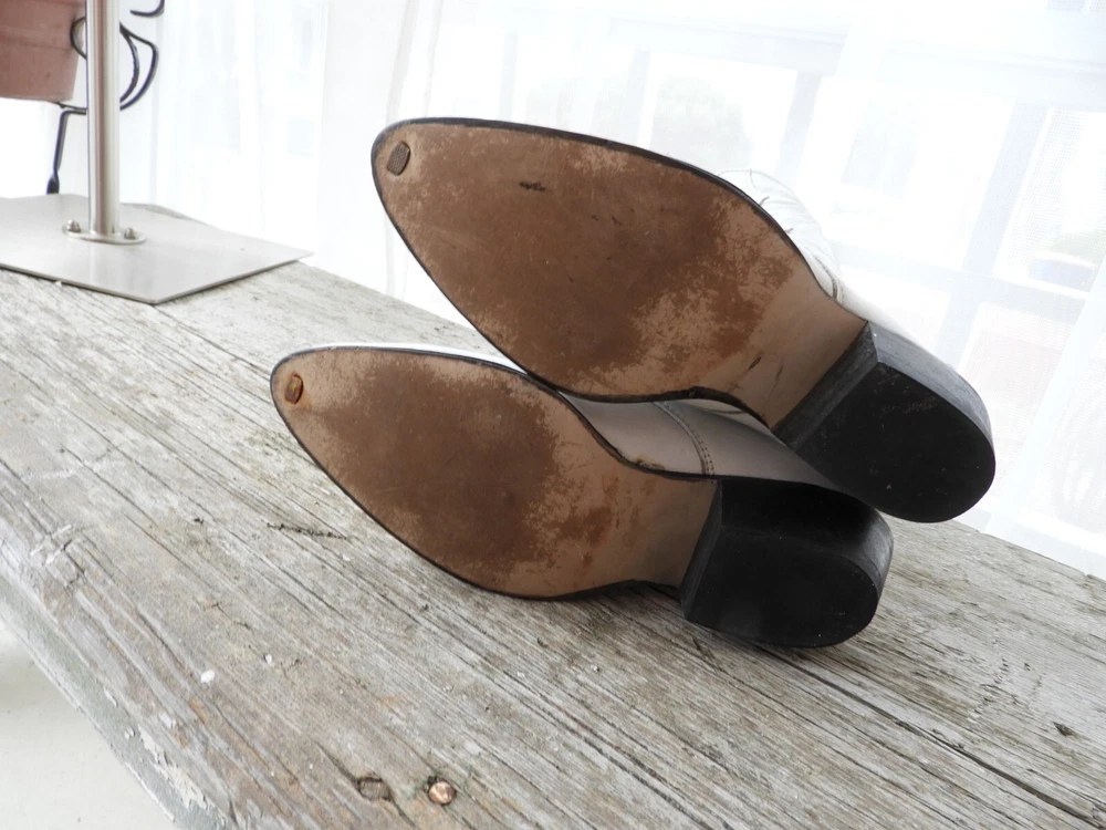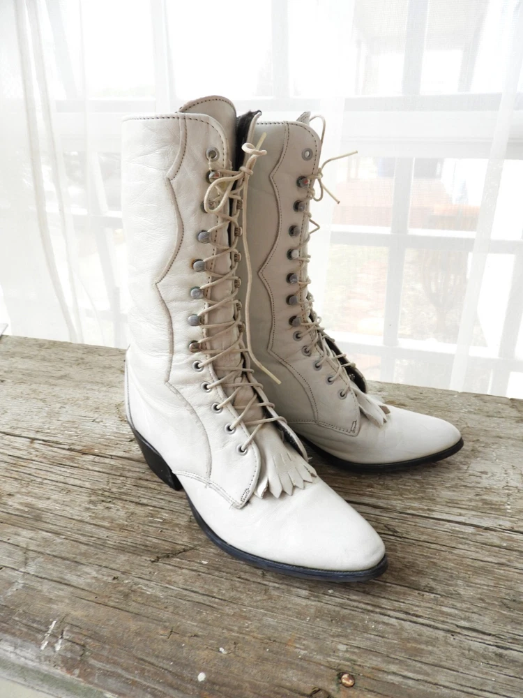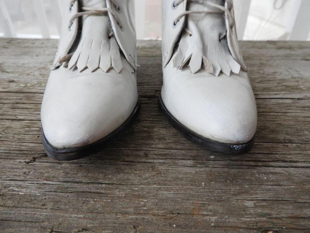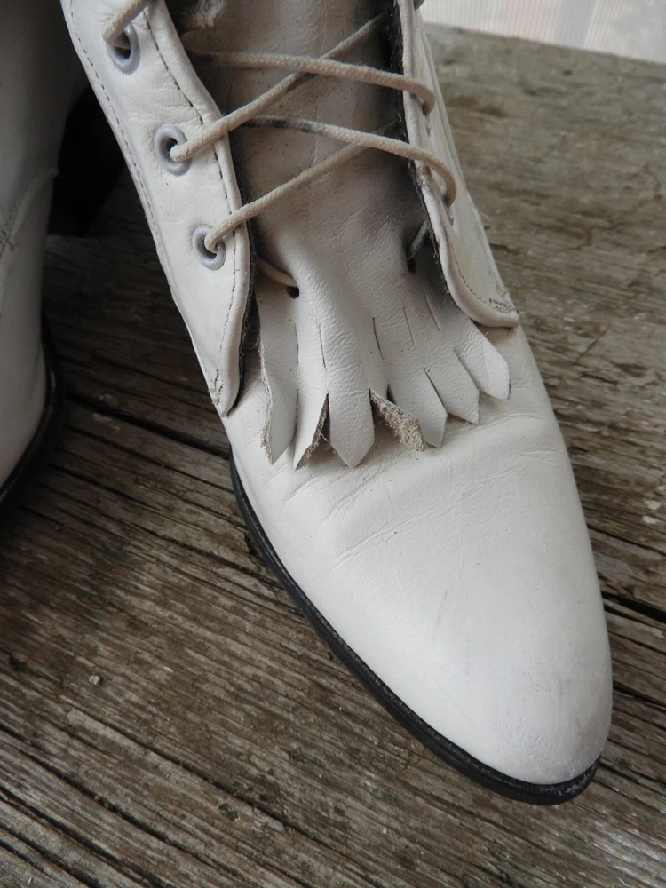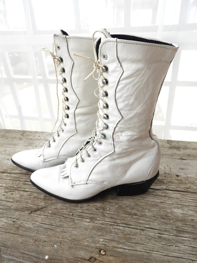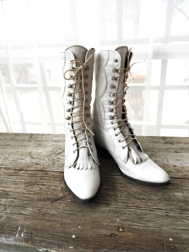 Vtg White Victorian Style Lace Up Shoes|Vtg 1980's Loredo Leather Prairie Boots|Ladies Speed Hook White Boots sz This is a great pair of Prairie boots by Loredo. They are white leather with 7 speed hooks. They have a pointed toe and low heel. They are a size 5 M and Made in the USA. I have polished these boots for you and they are ready to go! A great costume piece or wear with tights or short trousers. Good condition with a slight musty odor that can be aired out. I'll start that process! Overall wear as seen in the photo's provided. Thank you for visiting my Shop today! Do stop back, I'm adding new merchandise almost daily. Buy with Confidence! Domestic Shipping: FREE International Shipping: $49.95 (any overages to be refunded) Sorry, No Shipping to China at this time. Smoke free environment. International Bidders welcomed. USPS Shipping within 1 to 3 business days of payment. Combined shipping available on multiple purchase upon request. Returns accepted within 14 days of receipt of your purchase within return policy guidelines. Buyer to pay return shipping. Item to be returned to Seller within 5 days of the approved return request and received in the same condition as it was sent. Please feel free to contact me at anytime with any questions you may have. Contact me with any concerns regarding your purchase prior to leaving a review please. Happy Shopping!