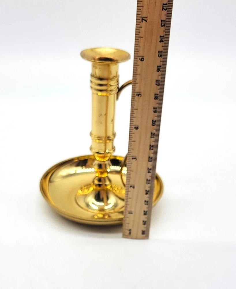 UNBRANDED STYLE: 1980s Colonial Classic Chamberstick Candleholder. MATERIAL: Gold Brass, Coated SIZE: Approximately 6" Tall and 5" Across. CONDITION: This is a classic, Colonial style Chamberstick Candleholder with curved handle from the 1980s. It is solid coated brass and is very nice quality. The circular base is attached with a nut and screw bottom. I have not attempted to polish it and have left that choice up to the taste of the buyer. It is an elegant piece and would look well in any decor. I have found no signs of dents or cracks in the item. Thank you for shopping with me and have a lovely day!!