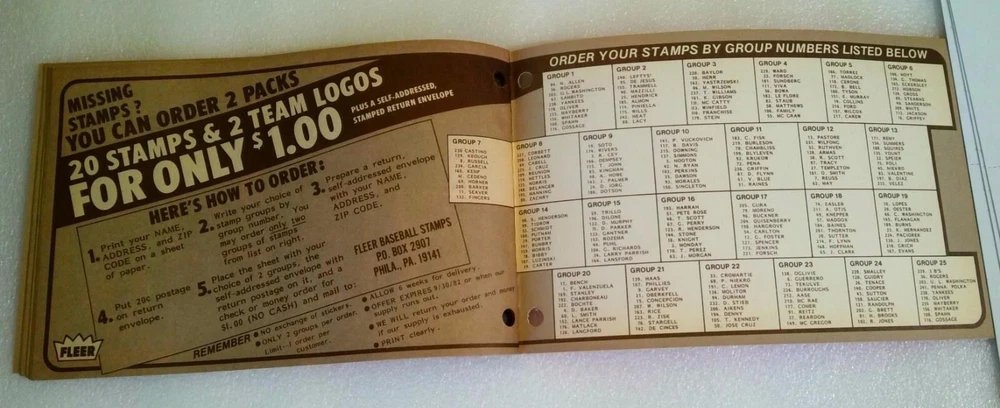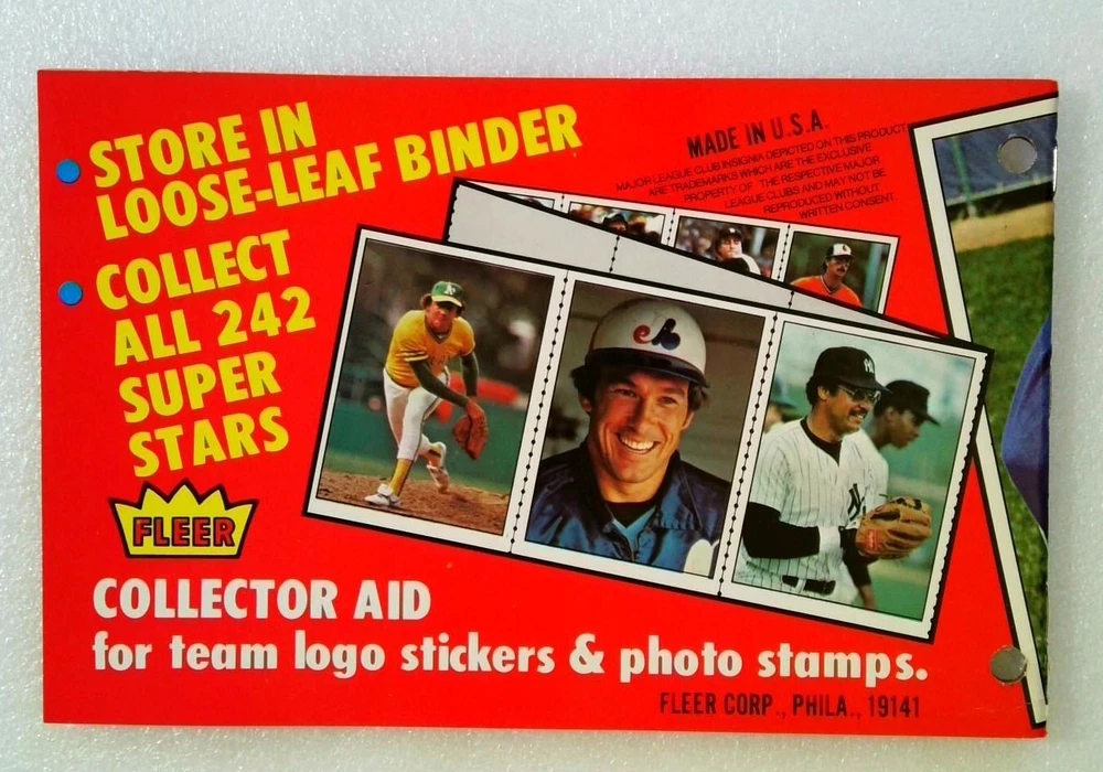 This is a vintage and untouched 1982 Fleer Baseball Logo Sticker & Stamp Album MLB Book. It features logos and stamps from multiple teams and players, making it a great addition to any baseball fan's collection. The album is an original piece, manufactured in the United States, and has not been modified in any way. It is a perfect item for collectors of vintage sports memorabilia.