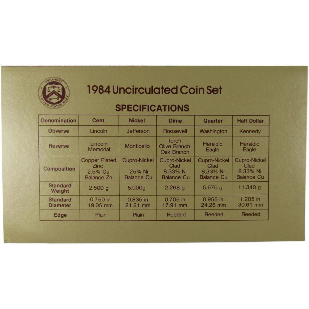 Home About Us Feedback View All Listings Contact Us Menu Home About Us Feedback View All Listings Contact Us 1984 Uncirculated Coin Set U.S Mint Original Government Packaging OGP This official 1984 U.S. Mint 10 coin Uncirculated Set contains Philadelphia and Denver Mint issues of the Kennedy half, Washington quarter, Roosevelt dime, Jefferson nickel & Lincoln cent. Comes with the original U.S. Mint packaging. Please note that Mint Sets prior to 2002 did not include a certificate of authenticity. These sets were made in 1984 and are not brand new. The packaging may show signs of wear such as minor folds and scrapes. The images used for this listing are stock photos from our inventory. Your purchase is guaranteed to match the quality of the product shown. Profile Coins & Collectibles - More Coins for the Money! Coin Type U.S. Mint Uncirculated Coin Set Denomination 1C, 5C, 10C, 25C, 50C Date 1984 Mint Mark P, D Grade Uncirculated Shop by category Coins: US Half Dollars Quarters Small Cents Dollars Dimes Nickels Three Cents Large Cents Two Cents Paper Money: US Store Newsletter Add our store to your Favorites to receive our email newsletters about new items & special promotions. Sign Up Home About Us Feedback View All Listings Contact Us Copyright © 2019 Profile Coins & Collectibles. All rights reserved. eBay template Design by OCDesignsOnline