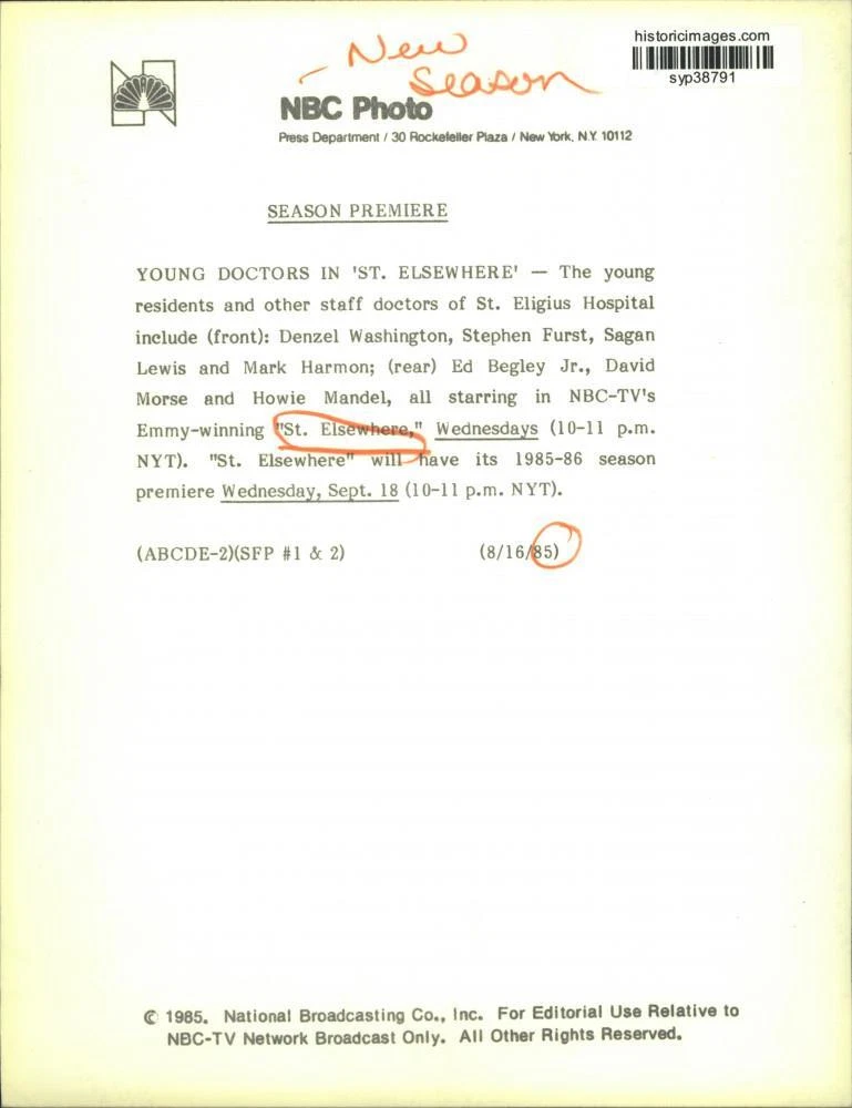 ebay template Note: Please study the images carefully to determine the condition of this vintage photograph, as it may not be in perfect condition. It may contain wrinkles, cracks, and possibly even tears due to its age and how it was handled before it got to us. A scanner may interpret colors and contrast differently than human eyes will, so it is possible that the actual photograph may be slightly darker or lighter in person. This vintage photograph is offered for sale as a collectible item and conveys no transfer of copyright. 1985 Press Photo Young Doctors in "St. Elsewhere" on NBC-Television - syp38791 This is an original press photo. Young doctors in "St. Elsewhere" - The young residents and other staff doctors of St. Eligius Hospital include (front): Denzel Washington, Stephen Furst, Sagan Lewis and Mark Harmon; (rear) Ed Begley, Jr., David Morse and Howie Mandel, all starring in NBC-Television's Emmy-winning "St. Elsewhere", Wednesdays (10-11 p.m. New York Time). "St. Elsewhere" will have its 1985-86 season premiere Wednesday, September 18 (10-11 p.m. New York Time).Photo measures 7 x 9.25inches. Photo is dated 08-16-1985. PHOTO FRONT PHOTO BACK Historic Images Part Number: syp38791 Sell Smarter with Kyozou. Inventory and Ecommerce Management