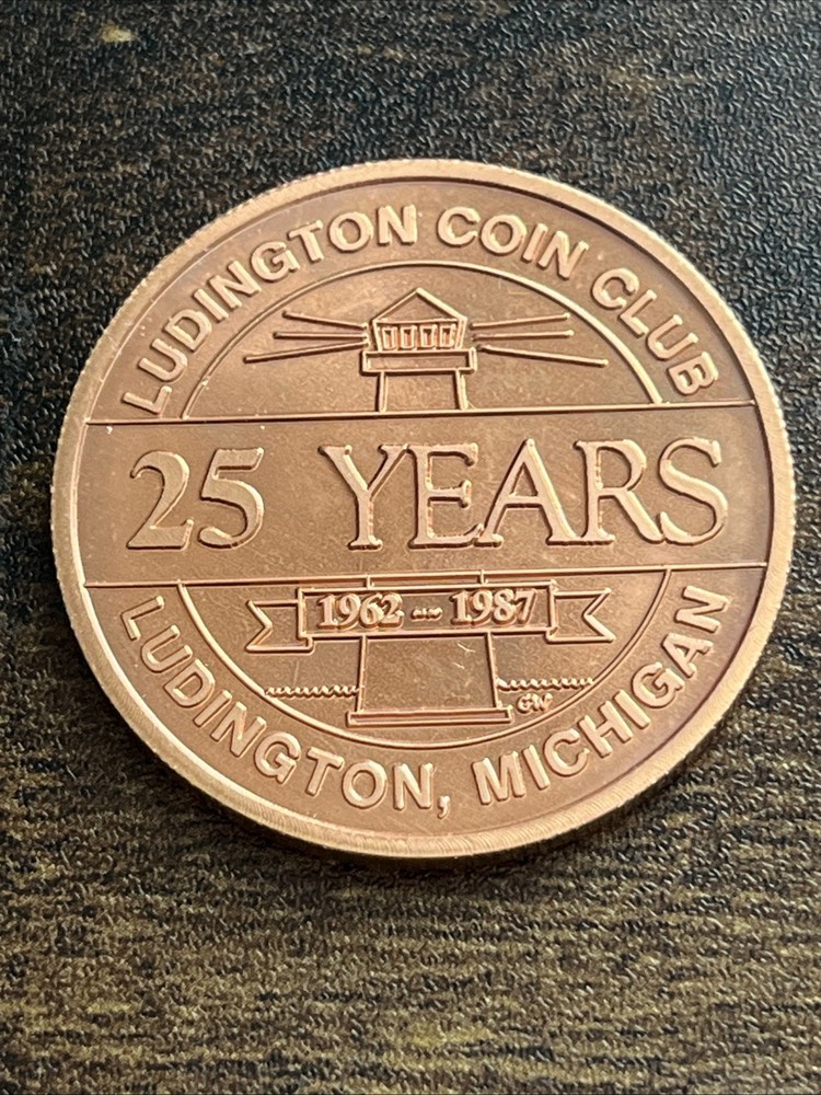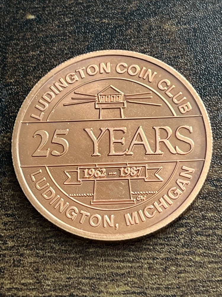 The product is a rare medal token commemorating the 25th anniversary of the Ludington Coin Club in Michigan. This unique piece is a valuable collectible for numismatists and history enthusiasts alike, showcasing the club's dedication to promoting coin collecting and education in the community. With its limited availability and historical significance, this token serves as a cherished keepsake for members and collectors alike.