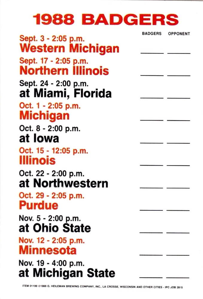 1988 Green Bay Packers, Badgers Football Pocket Schedule- Old Style Beer - See picture for condition. I’m a collector just trying to clear out space. All Items are used unless stated otherwise. I try and list any major flaws I see. Please check out my other lots. Shipping discounts on multiple auctions won!! Please email at close of auction for combined shipping. Ebay will not automaticly combine postage. We only ship to the US. Please pay or contact us within 7 days of closing or we have to report it as a nonpay to ebay. Check out my other auctions on Ebay. Thanks for looking!! Our items do NOT come from a smoke-free environment. Please be aware of this before you place a bid. We get our items from many different sources and they have probably been exposed to smoke - cigarette, cigar, pipe or other - or pets, so if these issues are likely to bother you, please reconsider bidding. I make every effort to accurately and honestly describe each item. Most items are vintage/pre-owned and are sold as such. The flaws I see are listed. Our items are sent to you clean but odors may still linger. My goal is that you, as a buyer, are happy with your purchase