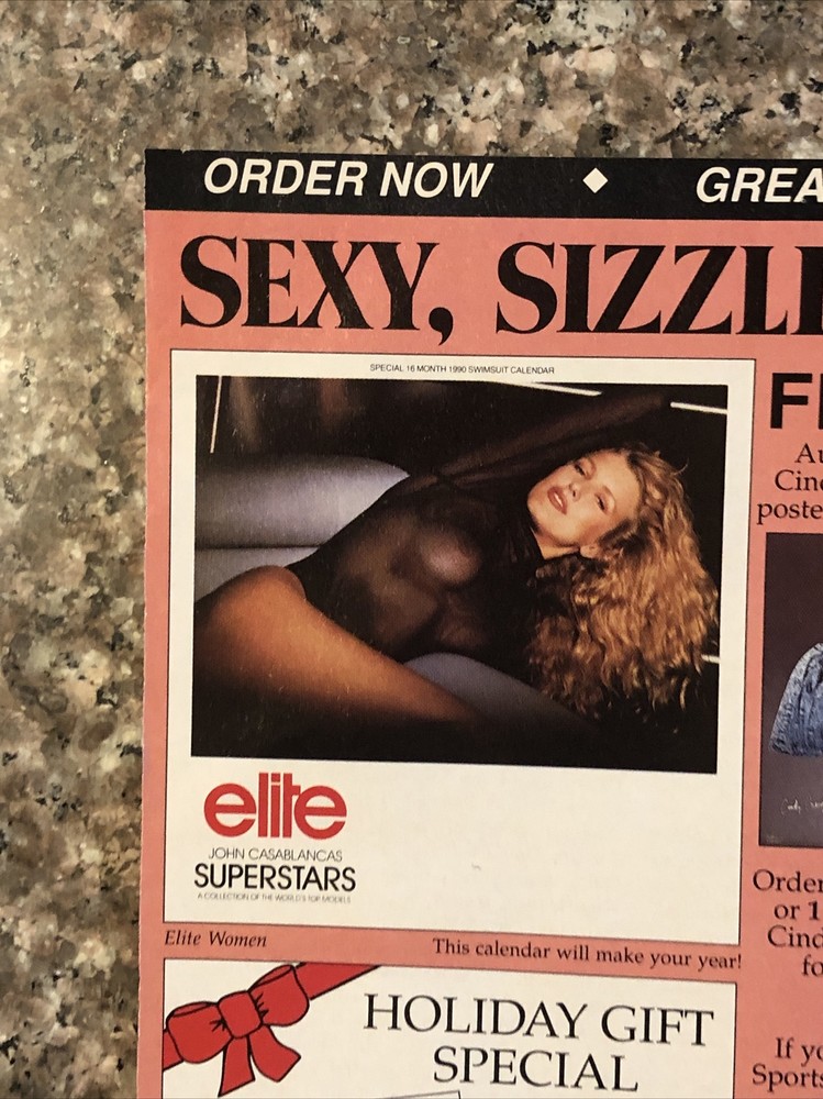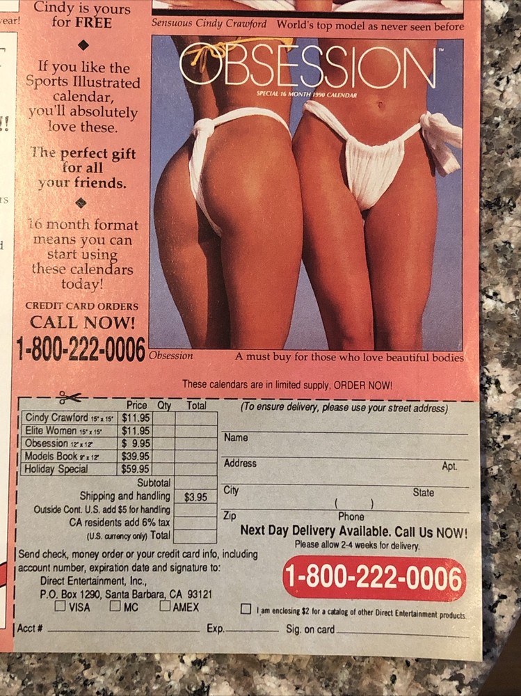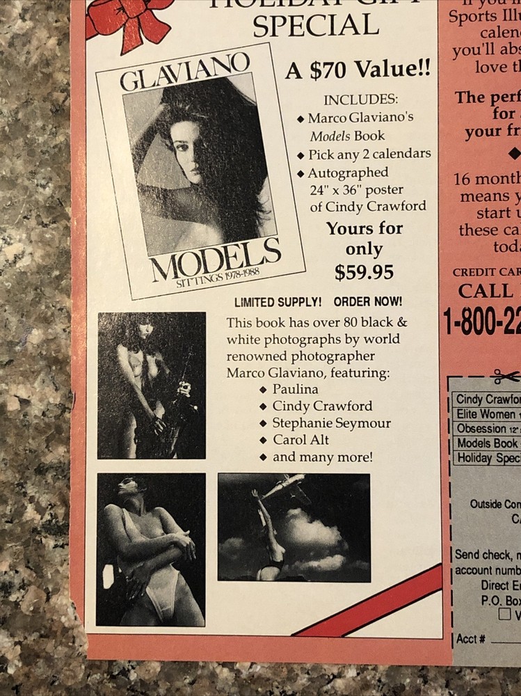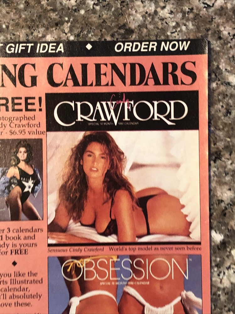 The product is a vintage 1989 magazine print ad from Direct Entertainment featuring Cindy Crawford in a bikini calendar promotion. The ad is multi-colored and measures approximately 8"x11". This collectible piece showcases the iconic 80s style and is a nostalgic throwback for fans of vintage advertising and Cindy Crawford memorabilia. Made in the United States, this promotional ad captures a piece of pop culture history from the late 1980s.