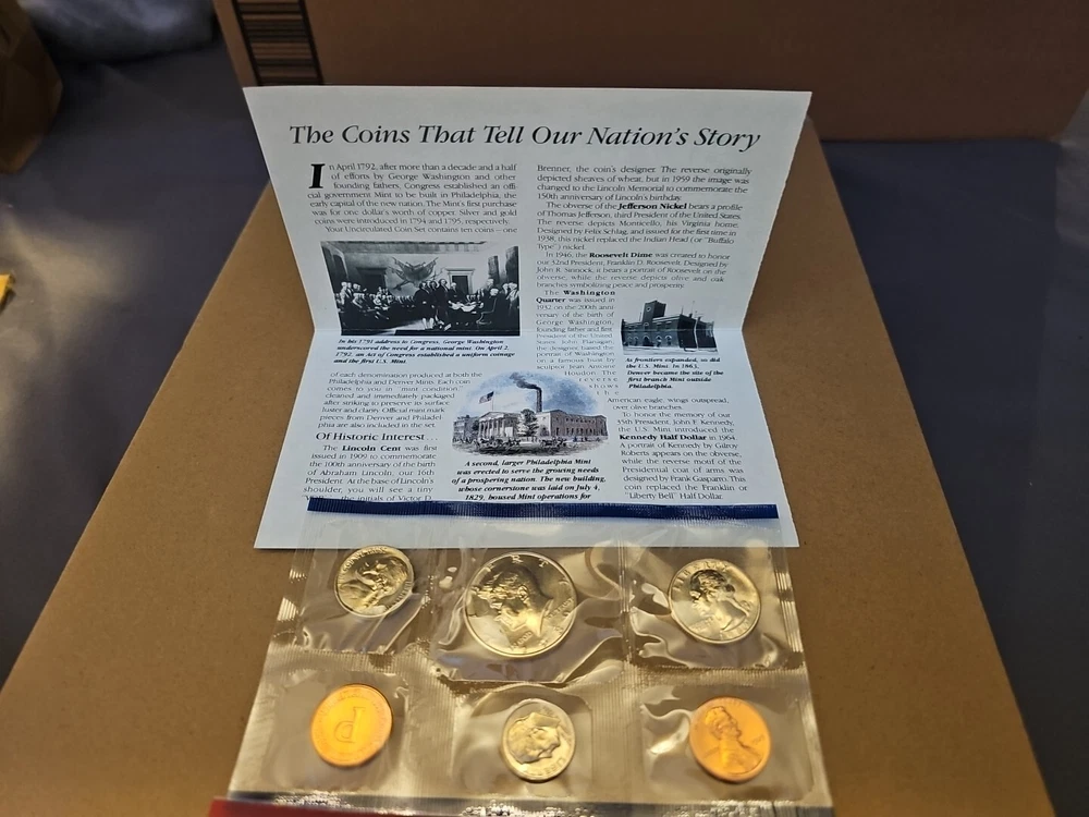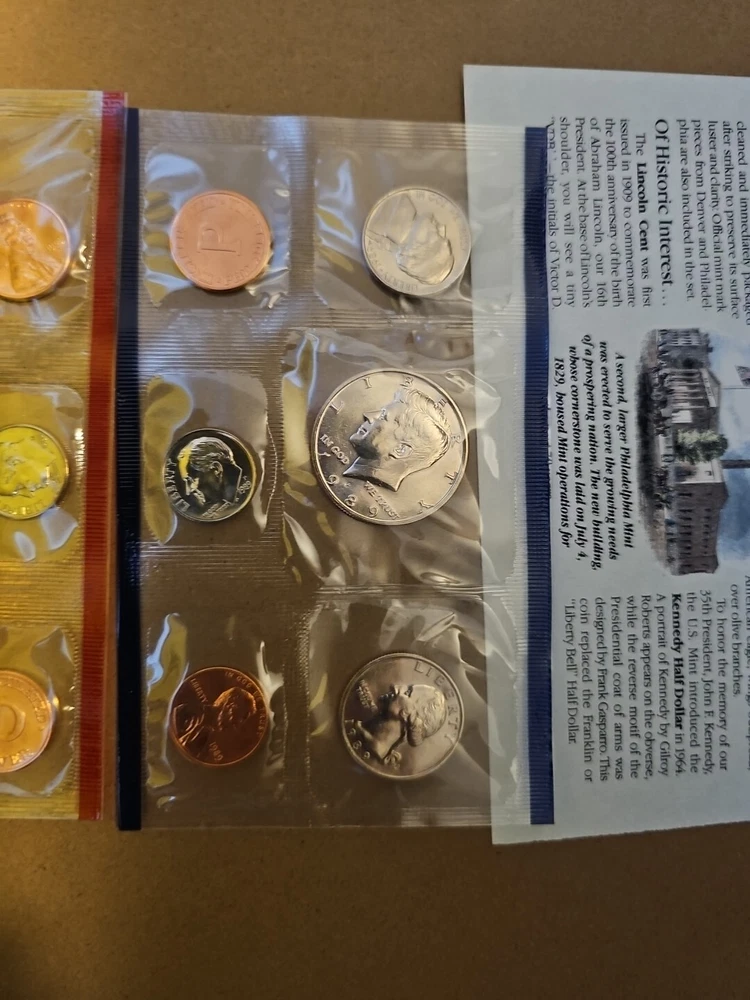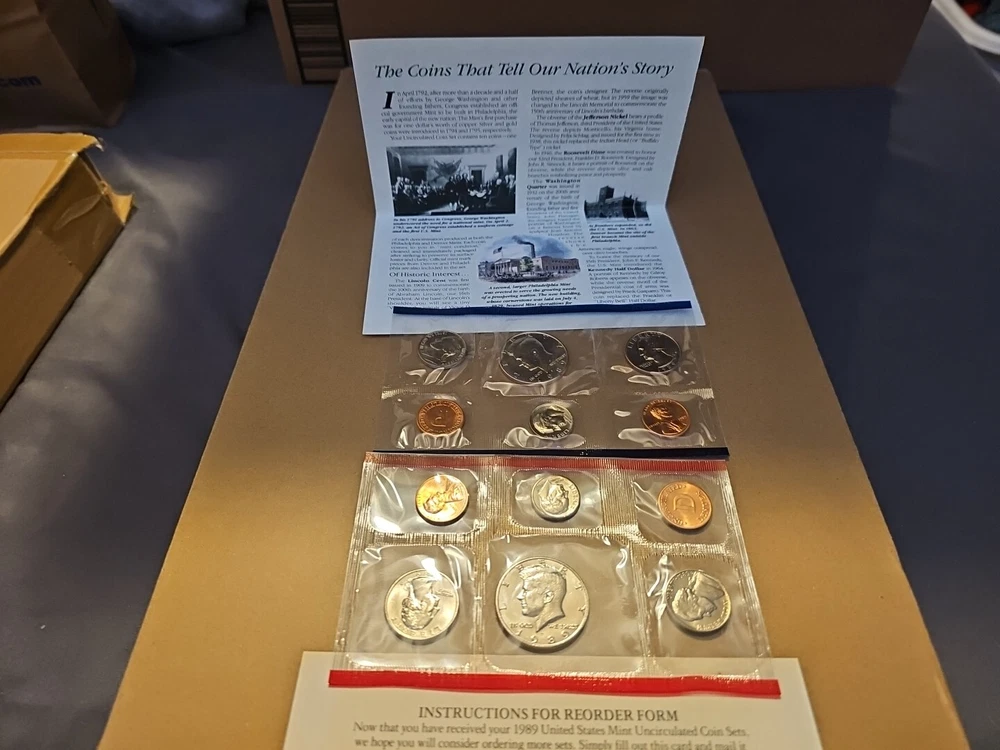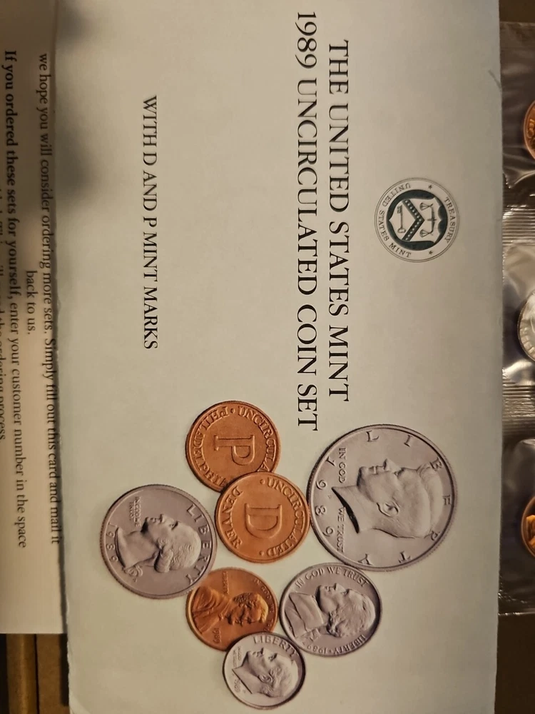This 1989 United States Mint Uncirculated Coin Set features coins with D and P marks from the Philadelphia Mint. The coins have a fineness of 0.9 and are ungraded, but have been certified by the U.S. Mint. The set includes coins from various denominations, all with the same striking type and mint location. The year 1989 marks the last year that the U.S. Mint produced coins with the same design as those from 1965 and 1966. These coins are highly sought after by coin collectors and make a great addition to any collection. Don't miss your chance to own this rare set!
