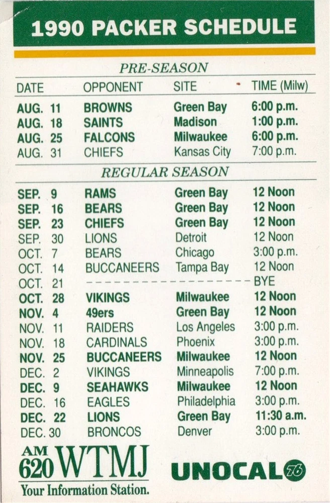 1990 Green Bay Packers, Badgers Football Pocket Schedule- Unocal - See picture for condition. I’m a collector just trying to clear out space. All Items are used unless stated otherwise. I try and list any major flaws I see. Please check out my other lots. Shipping discounts on multiple auctions won!! Please email at close of auction for combined shipping. Ebay will not automaticly combine postage. We only ship to the US. Please pay or contact us within 7 days of closing or we have to report it as a nonpay to ebay. Check out my other auctions on Ebay. Thanks for looking!! Our items do NOT come from a smoke-free environment. Please be aware of this before you place a bid. We get our items from many different sources and they have probably been exposed to smoke - cigarette, cigar, pipe or other - or pets, so if these issues are likely to bother you, please reconsider bidding. I make every effort to accurately and honestly describe each item. Most items are vintage/pre-owned and are sold as such. The flaws I see are listed. Our items are sent to you clean but odors may still linger. My goal is that you, as a buyer, are happy with your purchase