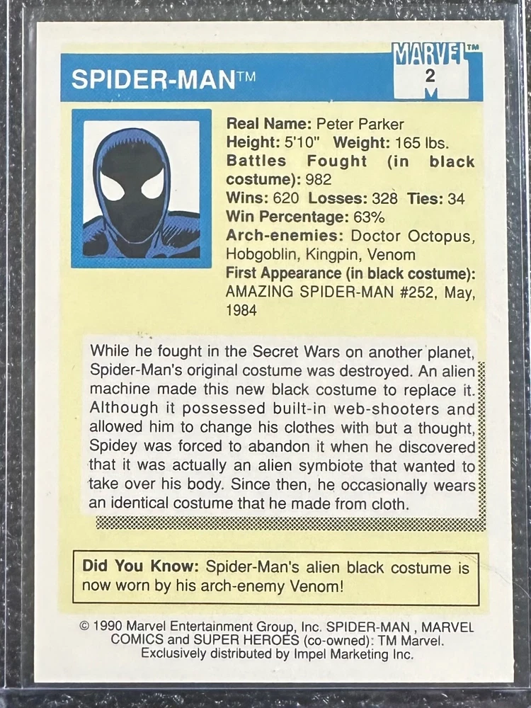 Features: Base Set Manufacturer: Impel Character: Spider-Man Type: Non-Sport Trading Card Vintage: Yes Language: English Country/Region of Manufacture: United States Original/Licensed Reprint: Original Year Manufactured: 1990 Franchise: Marvel (MCU) Set: 1990 Marvel Universe I