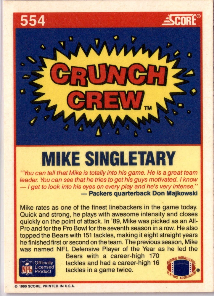 This is a nice example of a 1990 Score #554 Mike Singletary Other important information about this card: In 1990 Mike Singletary played for the Chicago Bears. Please check out our other listings for more great cards.