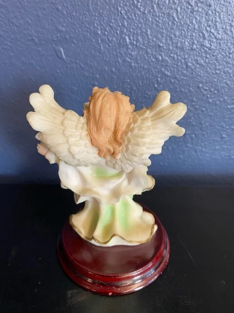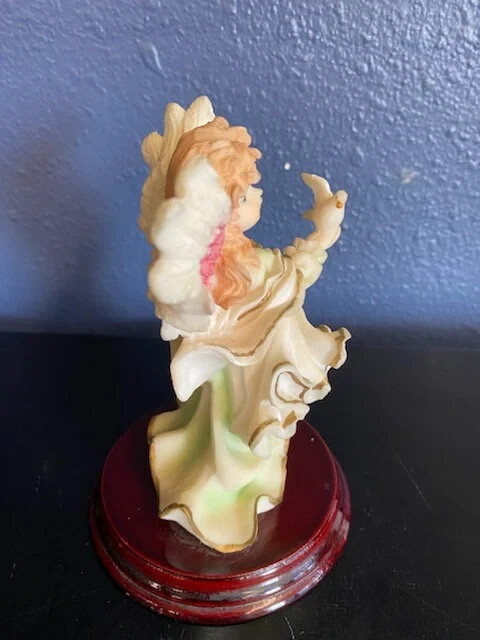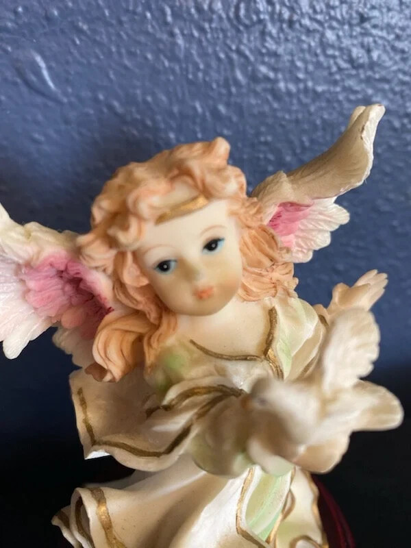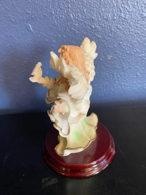 This vintage resin figurine from the 1990s features a charming little girl angel with pink and green hues, tenderly holding a dove. The piece is in excellent condition, though the base shows some slight blemishes, it remains in very good shape. Photos are provided as part of the description. The dimensions are 5 inches in height by 3.5 inches at the base. The figurine's detailed craftsmanship makes it an ideal choice for any collector or enthusiast of angelic figures or unique decor. Its vibrant colors bring a lively touch to any setting, drawing attention from onlookers. Constructed from premium resin, this figurine promises enduring quality and charm. With its angelic theme and character family, it adds a whimsical element to any collection or decorative arrangement. It is an excellent find for collectors or those in search of a distinctive adornment.