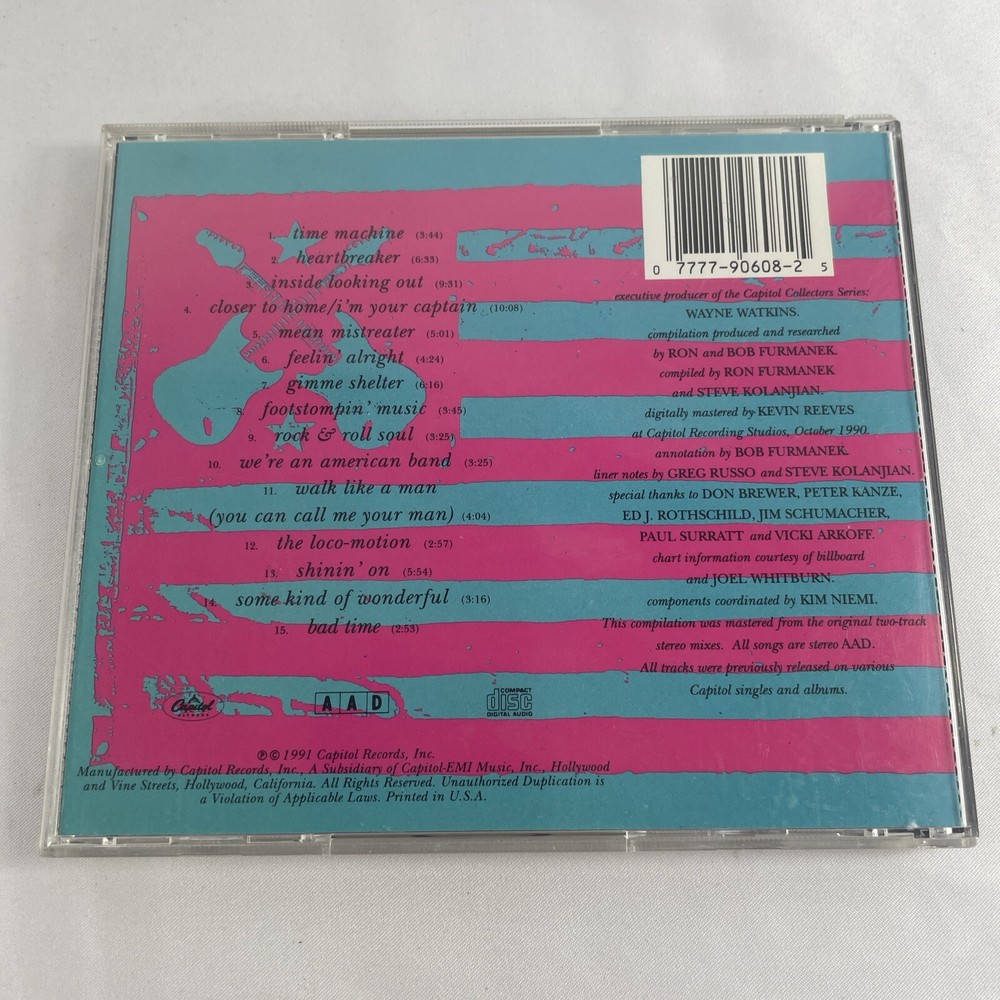 This CD features the iconic rock band Grand Funk Railroad and is part of the Capitol Collectors Series. The album showcases their classic rock style from the 1970s and includes hits such as "American Glory" and "This Is a Gas". The CD grading is very good plus (VG+), and the case and inlay conditions are also very good plus (VG+). The release year of this album is 1991, and it is in English language. The CD format is standard, and the case type is a jewel case. This item is perfect for collectors of classic rock and 1970s music.
