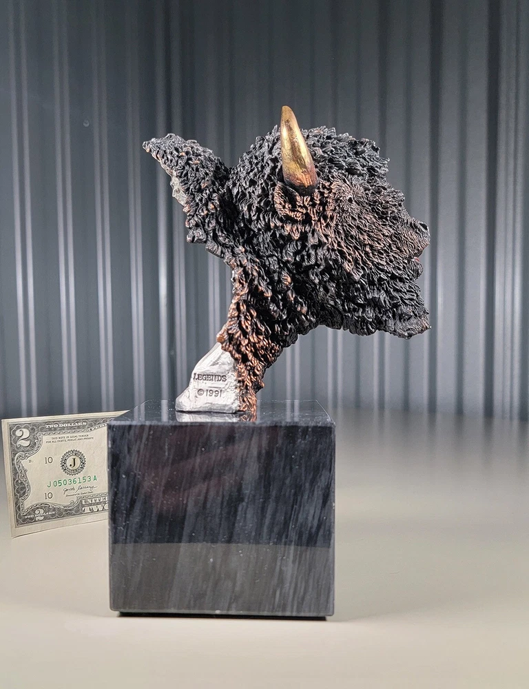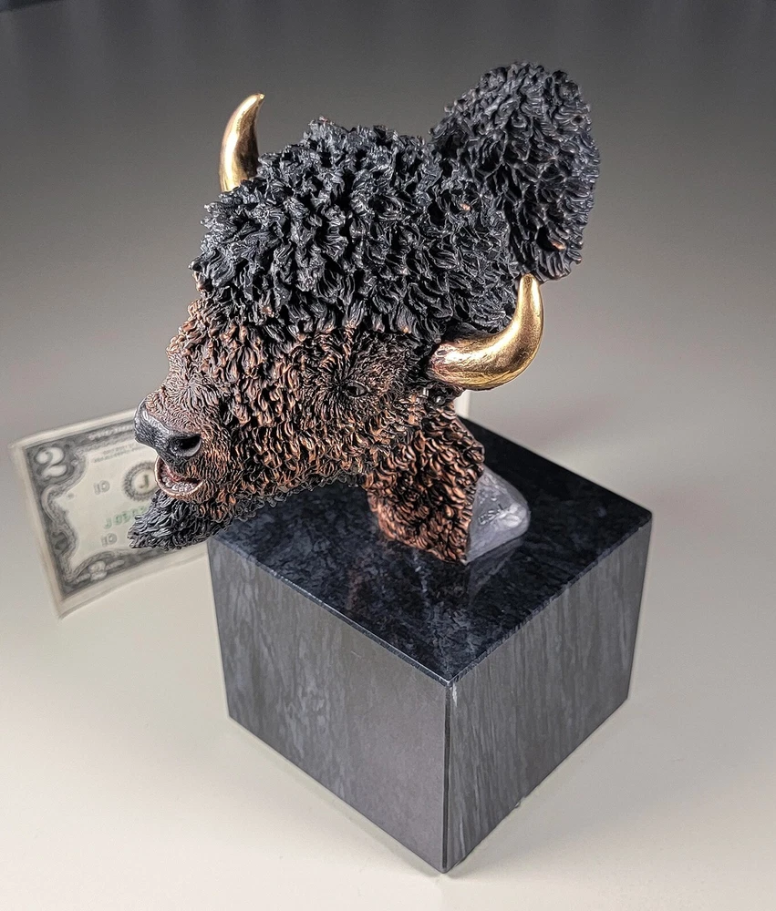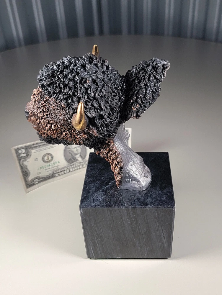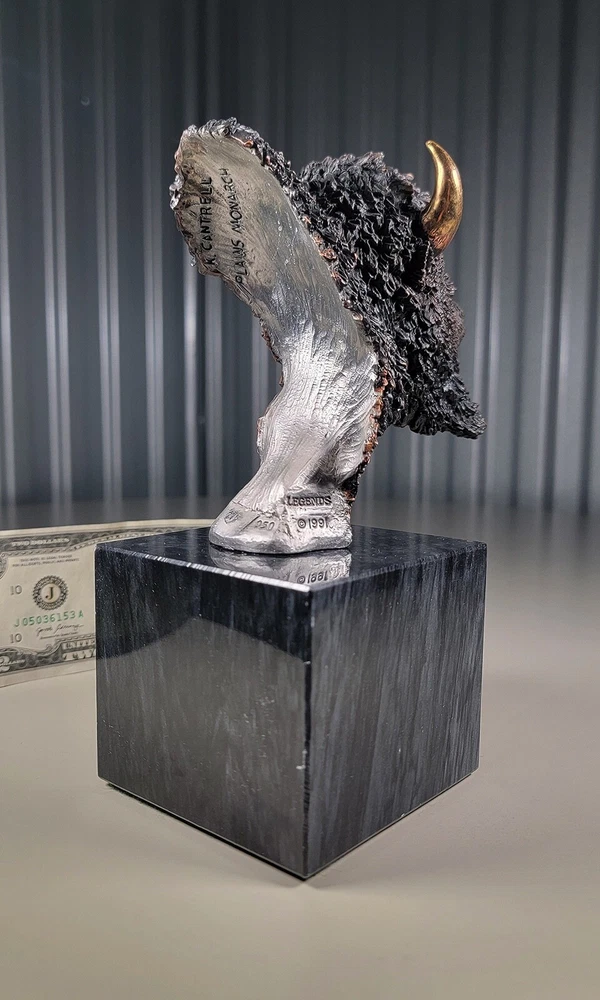 1991 KITTY CANTRELL Legends Wildlife Sculpture-BUFFALO-Plains Monarch DIMENSIONS: Overall: 8" tall x 5" deep x 3 3/4" wide. Weight: 8 lbs. DESCRIPTION: Vintage limited edition wildlife sculpture by KITTY CANTRELL. "Plains Monarch". Buffalo bust. "Legends" series. #275 from and edition of 950. Mixed media cast metal on a marble base with felted bottom. All original. Maker's marks: "K. Cantrell - Plains Monarch - Legends - ©1991 - 275/950 - U.S.A." in casting; gold foil label on bottom with an additional number stamp (illegible). No literature or original packaging is included. I recently acquired this sculpture from the original owner. CONDITION: Some very light handling wear: a few scattered miniscule edge rubs to the marble base. See photos. Nothing significant / conspicuous. Presumably the sculpture is secured with a nut on threaded rod underneath the felt. It isn't at all conspicuous when sitting, but when you pick the sculpture up it feels as if the nut isn't absolutely tight (but not so loose that the sculpture turns on its base). Otherwise excellent original condition with no damage and no significant wear. No restorations / repairs / touch ups. No chips, flakes, nicks, breaks, cracks, losses. No scratches, scuffs, bruises. No significant rubs. Very clean as found. No stains or discolorations. No oxidation, corrosion, etc. From a smoke free home. Condition is consistent with infrequent, careful handling.Excellent original condition.